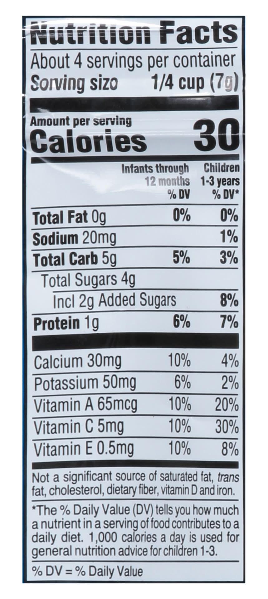 Contains: milk.,keep package away from children. this product should only be fed to seated, supervised children who are accustomed to chewing solid foods. product becomes difficult to chew if exposed to air. reseal immediately after opening. always check the product texture before serving.