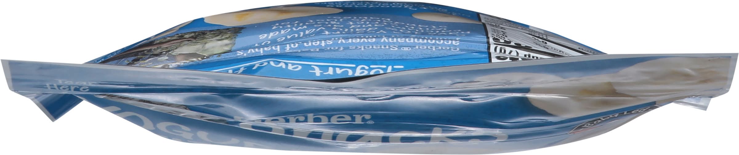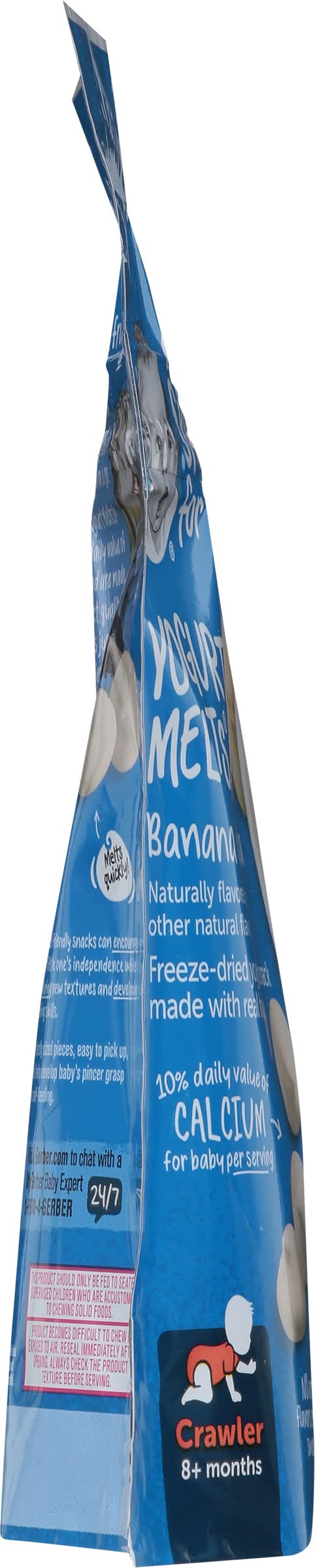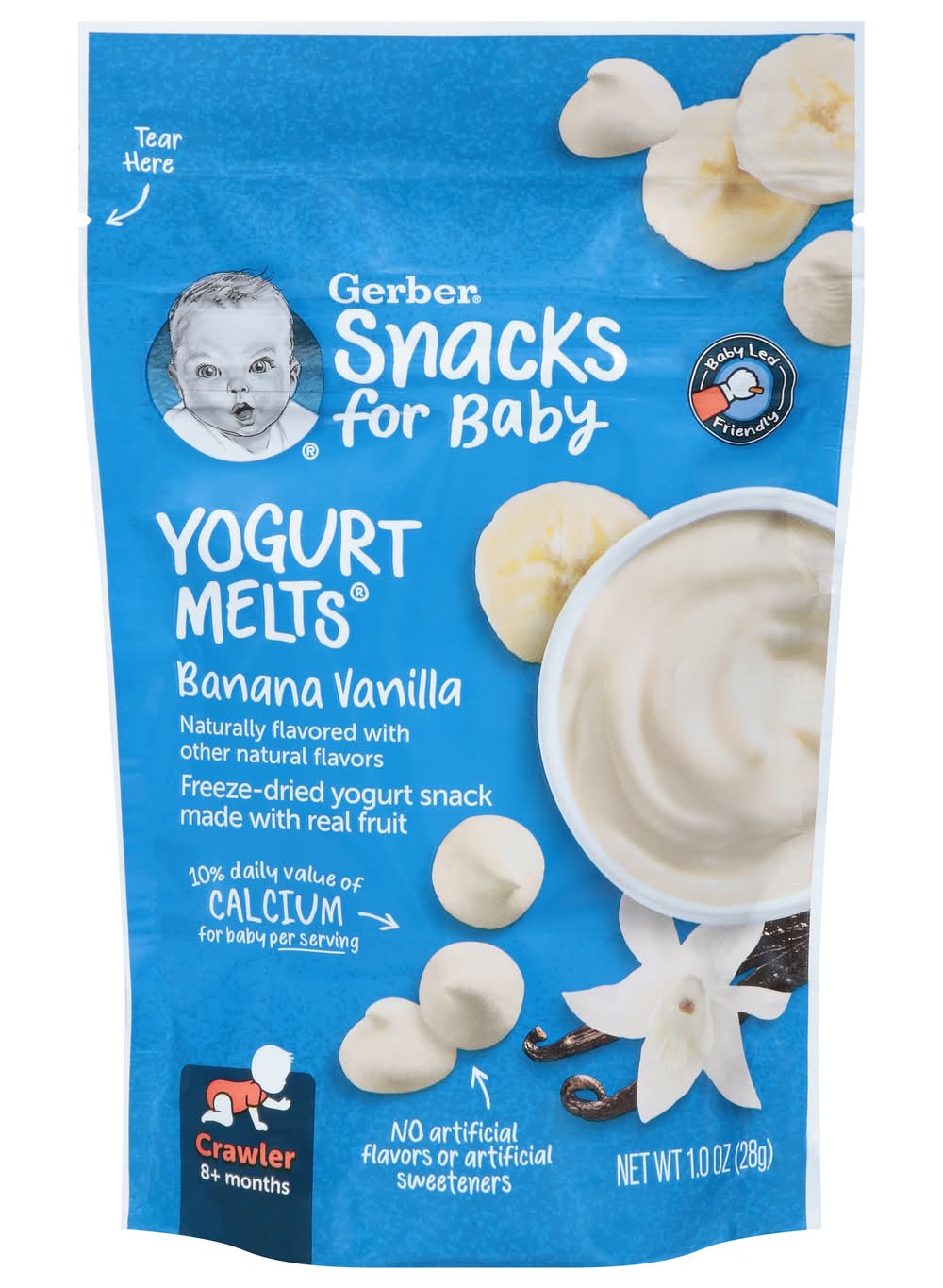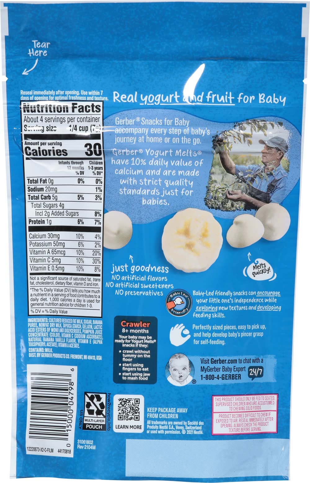 Naturally flavored with other natural flavors. No artificial flavors or artificial sweeteners. 10% daily value of calcium for baby per serving. Baby-Led friendly. Real fruit and veggies for baby. Gerber Snacks for Baby accompany every step of baby's journey at home or on the go. Gerber yogurt melts have 10% daily value of calcium and are made with strict quality standards just for babies. Just goodness. No artificial sweeteners. No preservatives. Melts quickly! Baby-Led friendly snacks can encourage your little one's independence while exploring new textures and developing feeding skills. Perfectly sized pieces, easy to pick up, and help develop baby's pincer grasp for self-feeding. Your baby may be ready for yogurt melts snacks if they: Crawl without tummy on the floor. Start using fingers to eat. Start using jaw to mash food. • Flavor: Banana vanilla • Size: 8+ Months • Gerber Products Co., Fremont, MI, 49413