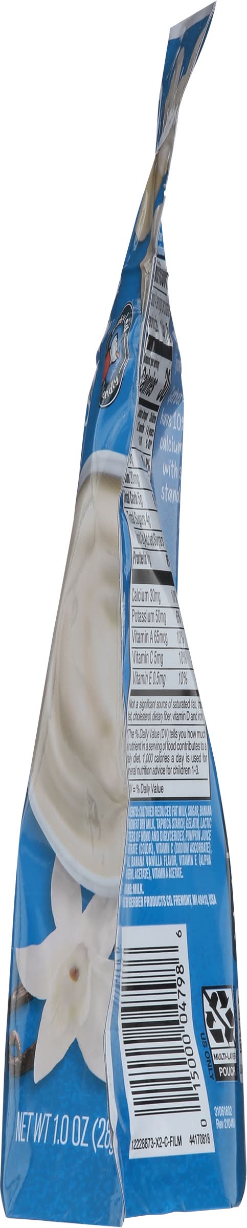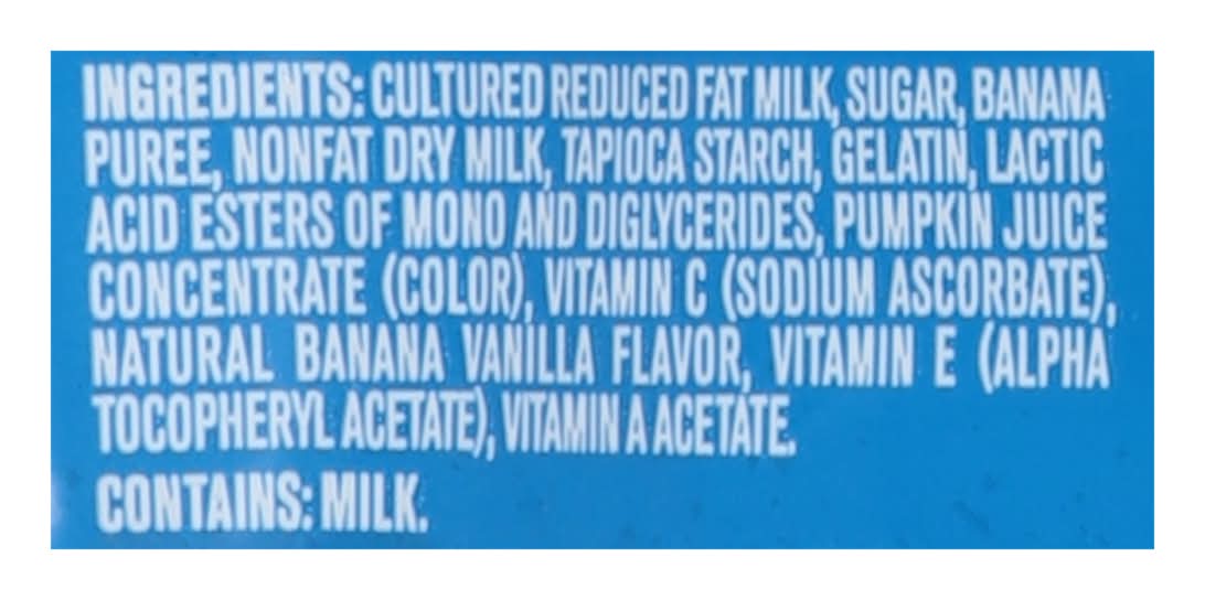 Ingredients: Cultured Reduced Fat Milk, Sugar, Banana Puree, Nonfat Dry Milk, Tapioca Starch, Gelatin, Lactic Acid Esters of Mono and Diglycerides, Pumpkin Juice Concentrate (Color), Vitamin C (Sodium Ascorbate), Natural Banana Vanilla Flavor, Vitamin E (Alpha Tocopheryl Acetate), Vitamin A Acetate Contains: Milk