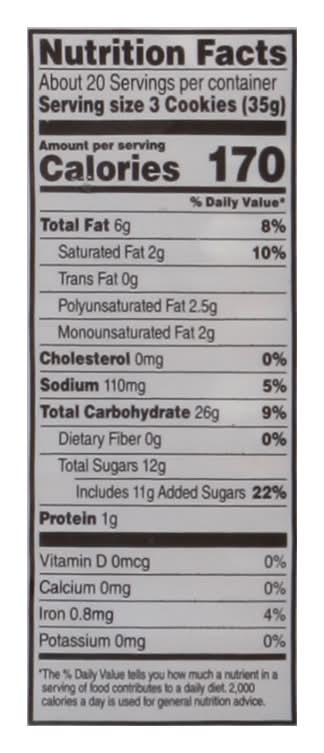 Cookies offer a sweet treat with each serving containing 170 calories and 2 grams of saturated fat, which is 10% of the daily value. Each serving also includes 110 milligrams of sodium, equating to 5% of the daily value, and 12 grams of total sugars. These cookies are artificially flavored and are made without preservatives or artificial colors. They come packaged in a plastic wrap and rest on a plastic tray. Flavor: Vanilla
