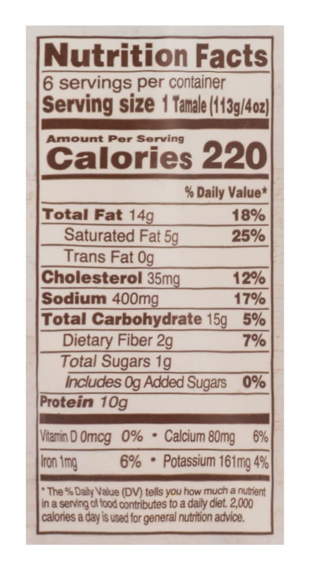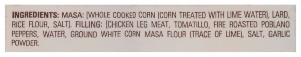 Ingredients: Masa: [Whole Cooked Corn (Corn Treated with Lime Water), Lard, Rice Flour, Salt], Filling: [Chicken Leg Meat, Tomatillo, Fire Roasted Poblano Peppers, Water, Ground White Corn Masa Flour (Trace of Lime), Salt, Garlic Powder