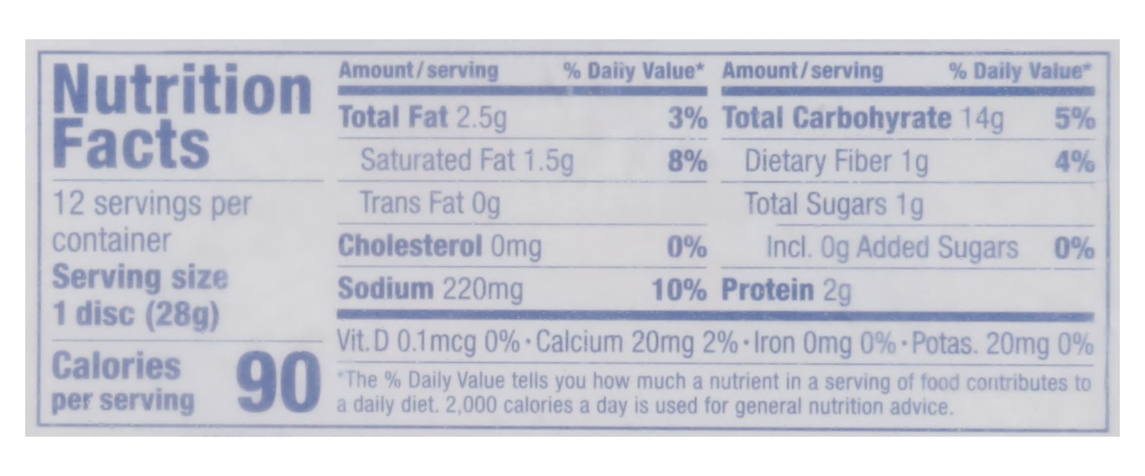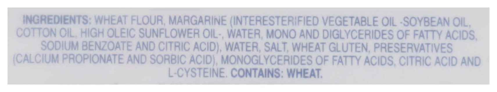 Ingredients: Wheat Flour, Margarine (Interesterified Vegetable Oil -Soybean Oil, Cotton Oil, High Oleic Sunflower Oil, Water, Mono and Diglycerides of Fatty Acids, Sodium Benzoate and Citric Acid), Water, Salt, Wheat Gluten, Preservatives (Calcium Propionate and Sorbic Acid), Monoglycerides of Fatty Acids, Citric Acid and L-Cysteine Contains: Wheat, Soybeans, Gluten