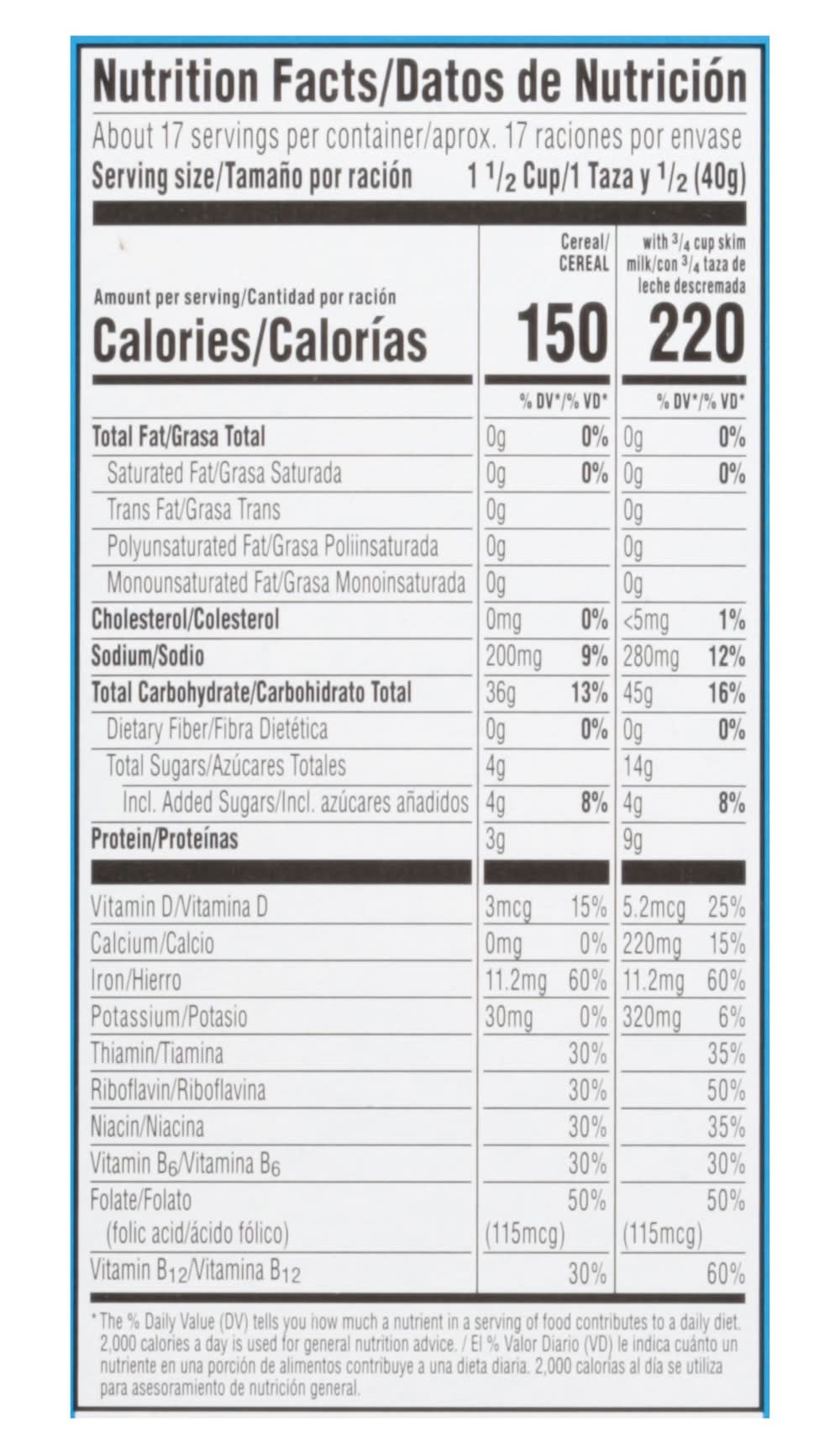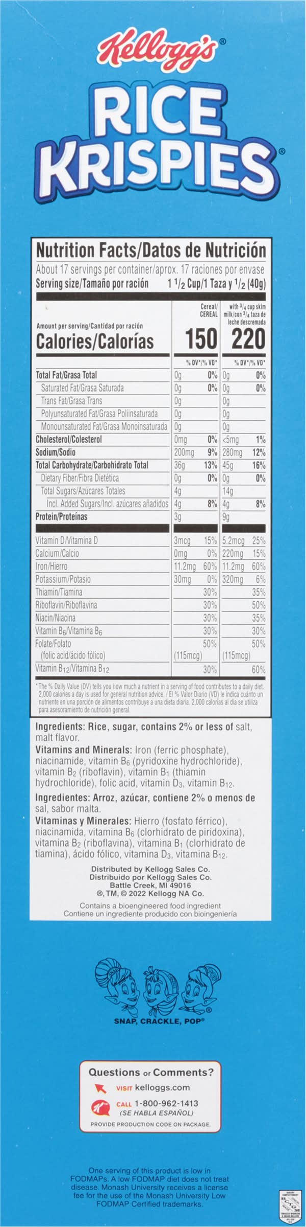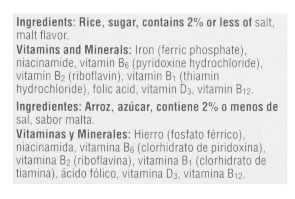 Ingredients: Rice, Sugar, Contains 2% or Less of Salt, Malt Flavor. Vitamins and Minerals: Iron (Ferric Phosphate), Niacinamide, Vitamin B6 (Pyridoxine Hydrochloride), Vitamin B2 (Riboflavin), VItamin B1 (Thiamin Hydrochloride), Folic Acid, Vitamin D3, VItamin B12
