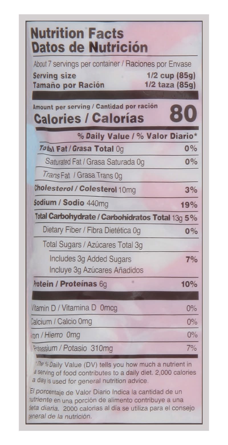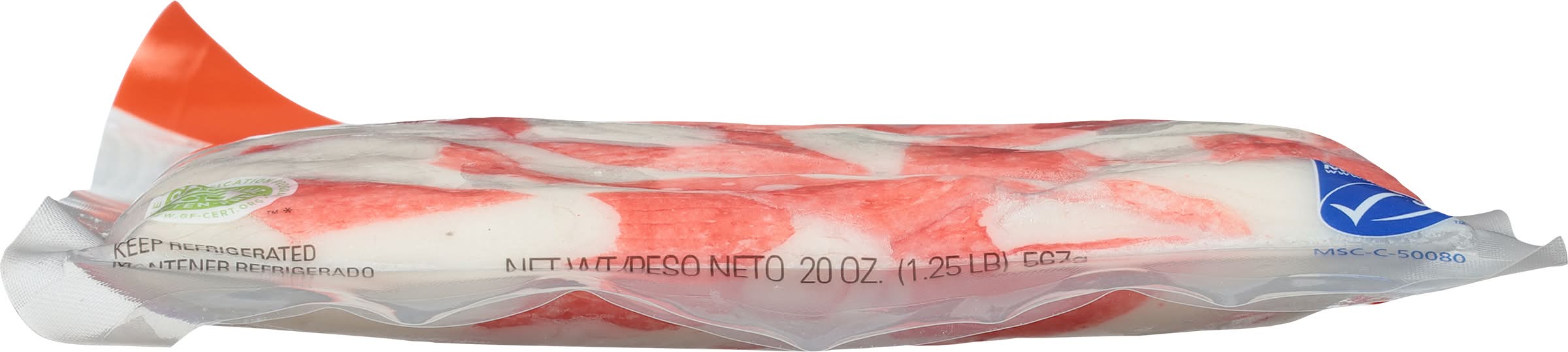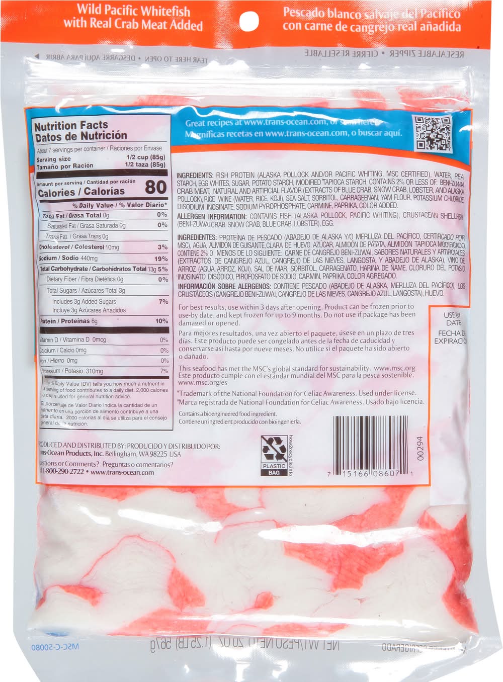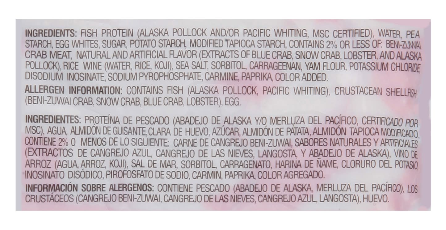 Ingredients: Fish Protein (Alaska Pollock and/or Pacific Whiting, MSC Certified), Water, Pea Starch, Egg Whites, Sugar, Potato Starch, Modified Tapioca Starch, Contains 2% or Less of: Beni-Zuwai Crab Meat, Natural and Artificial Flavor (Extracts of Blue Crab, Snow Crab, Lobster, and Alaska Pollock), Rice Wine (Water, Rice, Koji), Sea Salt, Sorbitol, Carrageenan, Yam Flour, Potassium Chloride, Disodium Inosinate, Sodium Pyrophosphate, Carmine, Paprika, Color Added Contains: Contains Fish', 'Contains Crustacean Shellfish', 'Contains Eggs', 'Contains Soybeans'