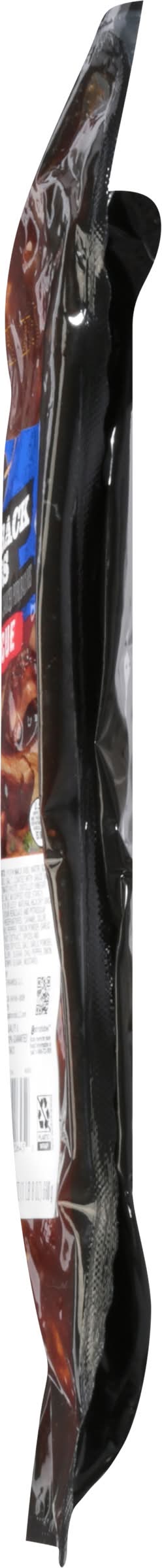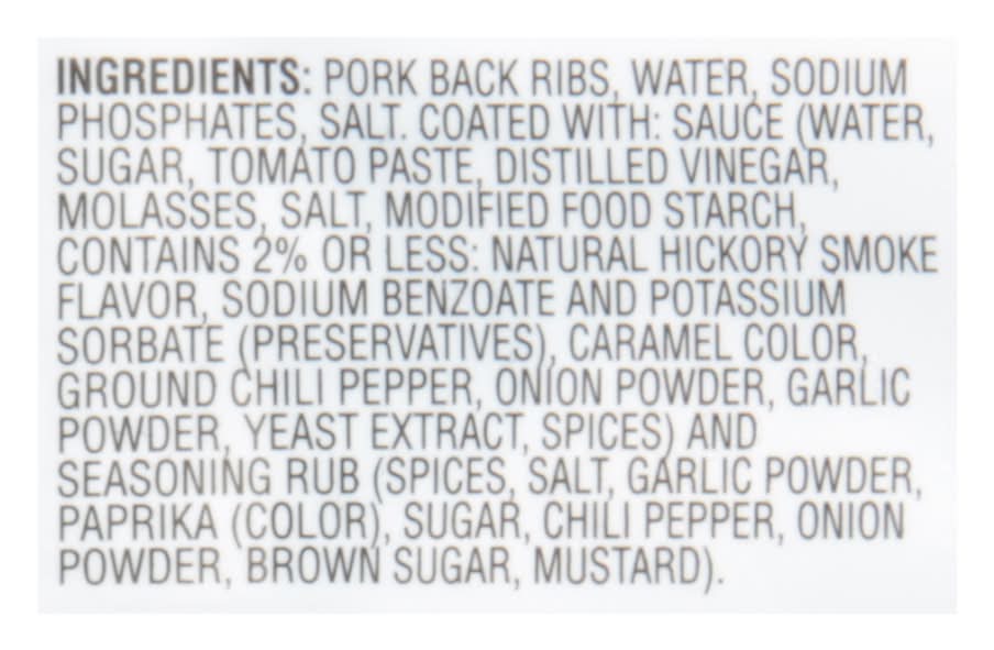 Ingredients: Pork Back Ribs, Water, Sodium Phosphates, Salt, Coated with: Sauce (Water, Sugar, Tomato Paste, Distilled Vinegar, Molasses, Salt, Modified Food Starch, Contains 2% or Less: Natural Hickory Smoke, Flavor, Sodium Benzoate and Potassium Sorbate (Preservatives), Caramel Color, Ground Chili Pepper, Onion Powder, Garlic Powder, Yeast Extract, Spices) and Seasoning Rub (Spices, Salt, Garlic Powder, Paprika (Color), Sugar, Chili Pepper, Onion Powder, Brown Sugar, Mustard Contains: Mustard