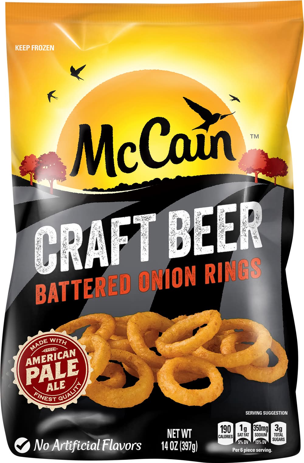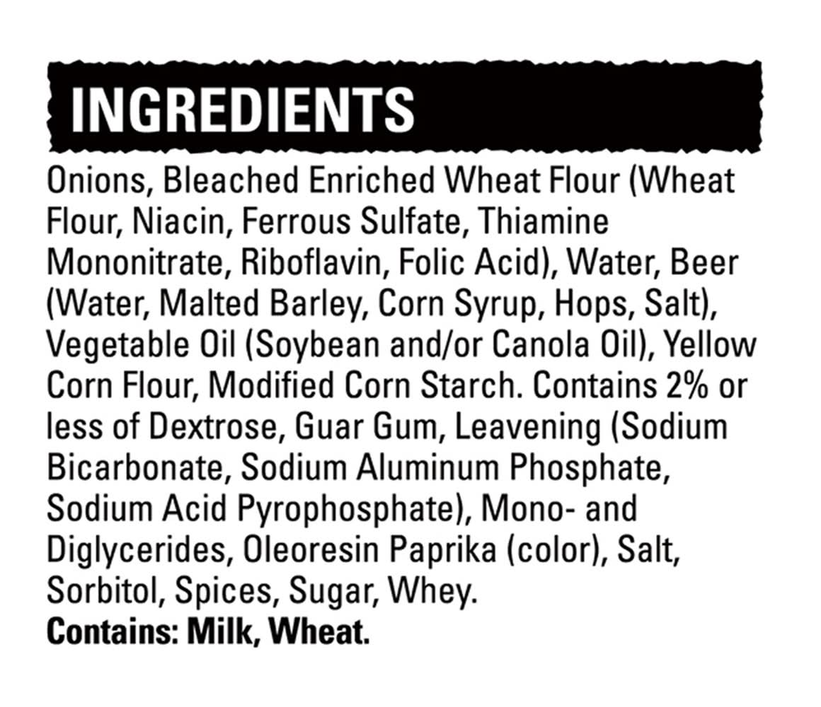 Ingredients: Onions, Bleached Enriched Wheat Flour (Wheat Flour, Niacin, Ferrous Sulfate, Thiamine Mononitrate, Riboflavin, Folic Acid), Water, Beer (Water, Malted Barley, Corn Syrup, Hops, Salt), Vegetable Oil (Soybean and/or Canola Oil), Yellow Corn Flour, Modified Corn Starch, Contains 2% or Less of Dextrose, Guar Gum, Leavening (Sodium Bicarbonate, Sodium Aluminum Phosphate, Sodium Acid Pyrophosphate), Mono- and Diglycerides, Oleoresin Paprika (Color), Salt, Sorbitol, Spices, Sugar, Whey Contains: Milk, Wheat, Barley, Corn, Soybeans Additives: Genetically Modified Ingredients