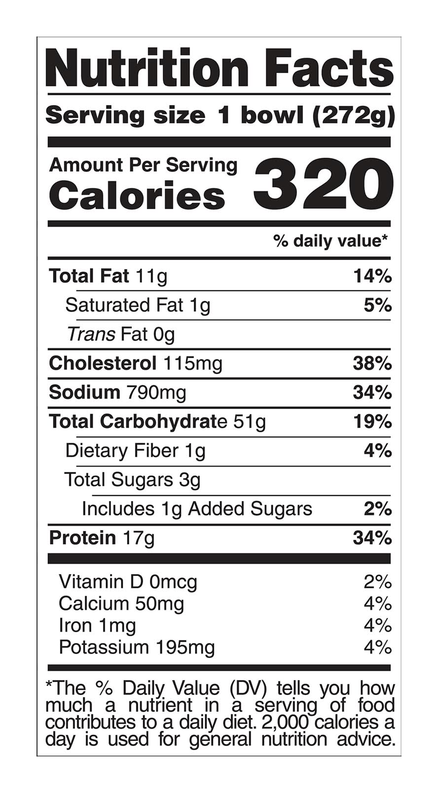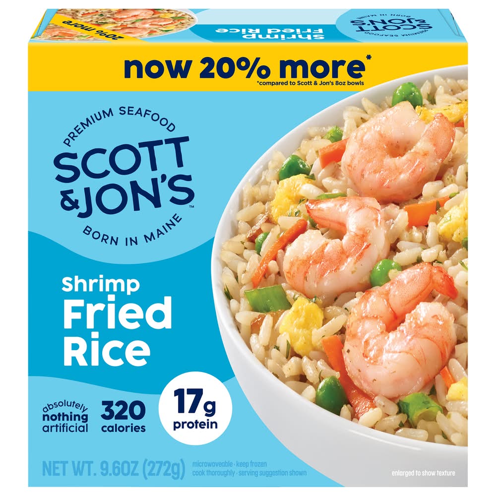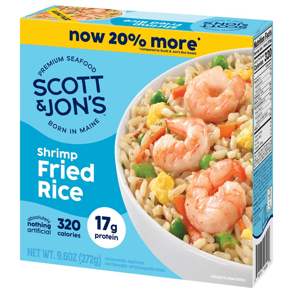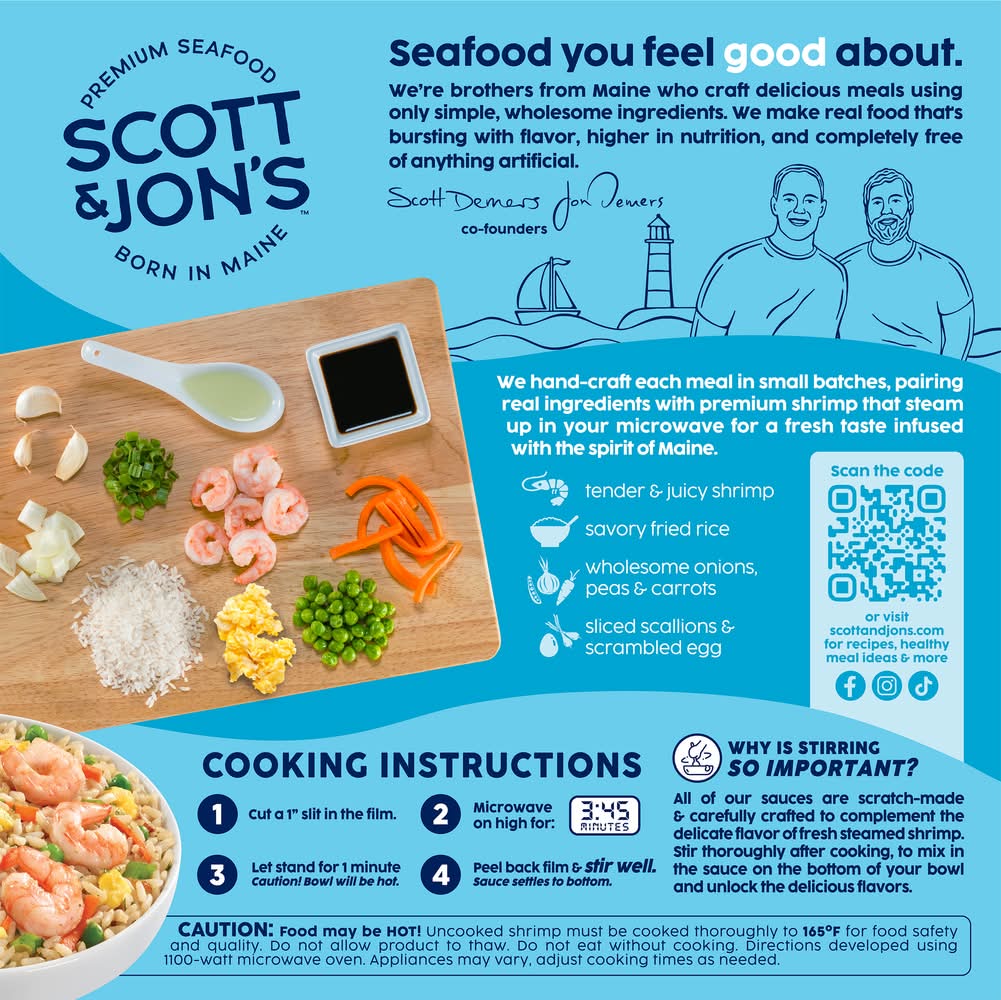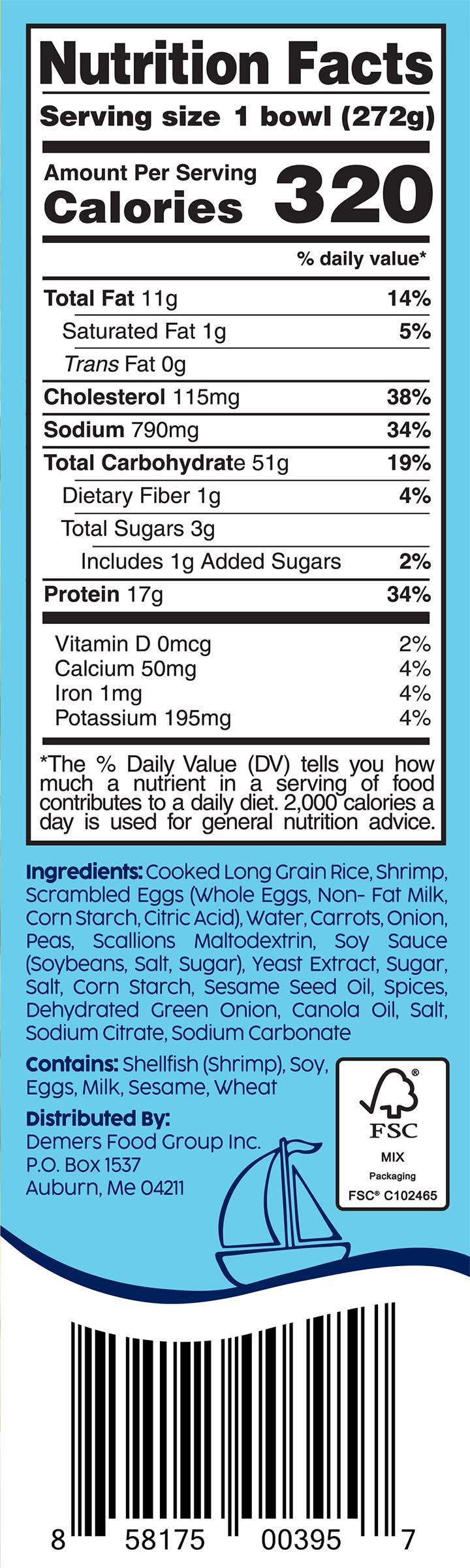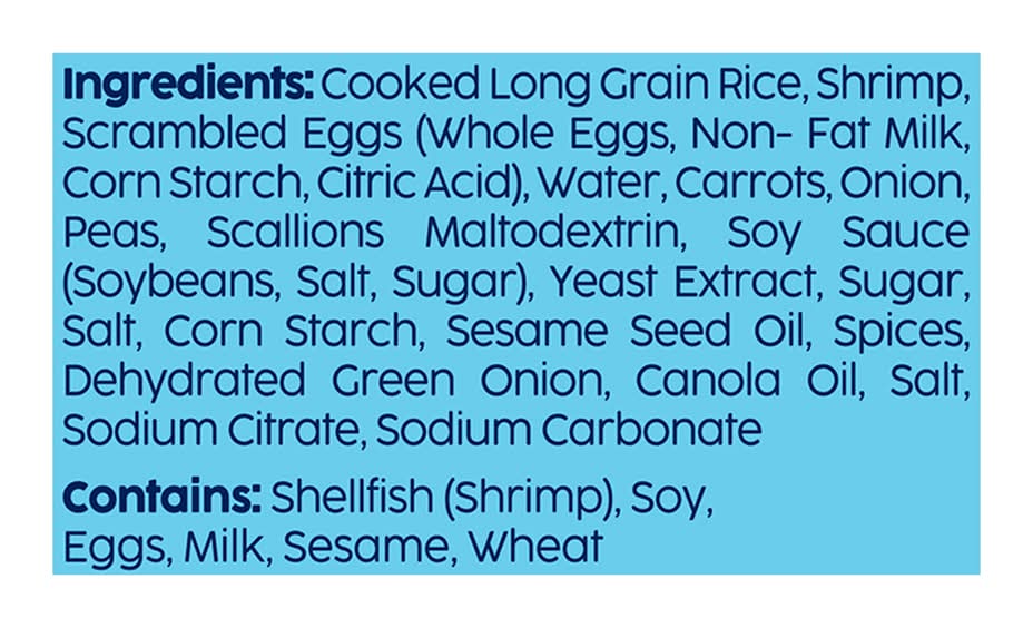 Ingredients: Cooked Long Grain Rice, Shrimp, Scrambled Eggs (Whole Eggs, Non- Fat Milk, Corn Starch, Citric Acid), Water, Carrots, Onion, Peas, Scallions Maltodextrin, Soy Sauce (Soybeans, Salt, Sugar), Yeast Extract, Sugar, Salt, Corn Starch, Sesame Seed Oil, Spices, Dehydrated Green Onion, Canola Oil, Salt, Sodium Citrate, Sodium Carbonate Contains: Crustacean Shellfish, Shrimp, Soybeans, Eggs, Milk, Sesame, Wheat, Corn