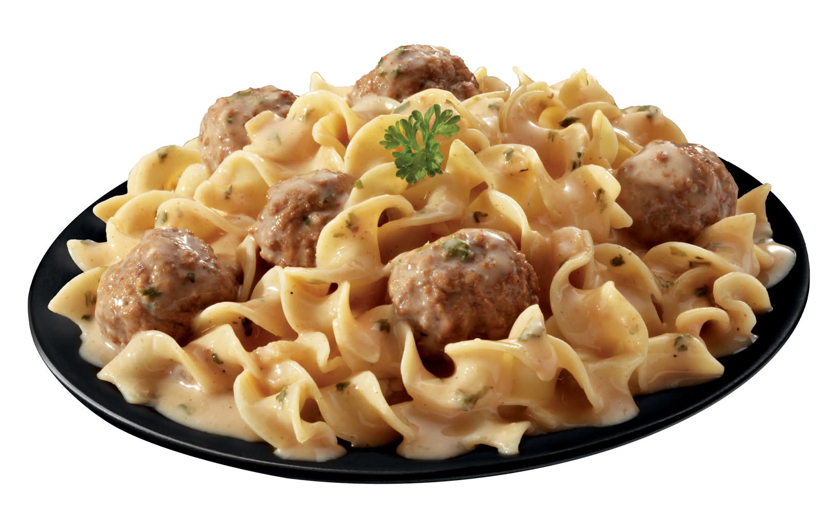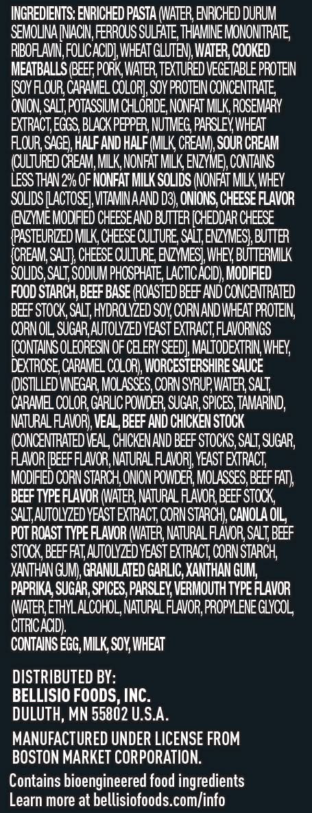 Ingredients: Enriched Pasta (Water Enriched Durum Semolina Niacin Ferrous Sulfate Thiamine Mononitrate Riboflavin Folic Acid), Wheat Gluten), Water, Cooked Meatballs (Beef Pork Water Textured Vegetable Protein Soy Flour Caramel Colori Soy Protein Concentrate Onion Salt Potassium Chloride Nonfat Milk Rosemary Extract Eggs Black Pepper Nutmeg Parsley Wheat Flour Sage), Half and Half (Milk Cream), Sour Cream (Cultured Cream Milk Nonfat Milk Enzyme Contains Less than 2% of Nonfat Milk Solids (Nonfat Milk Whey Solids (Lactose), Vitamin A and D3), Onions, Cheese Flavor Enzyme Modified Cheese and Butter (Cheddar Cheese (Pasteurized Milk Cheese Culture Salt Enzymes), Butter, Cheese Culture, Enzymes}, Whey, Buttermilk Solids, Salt, Sodium Phosphate, Lactic Acid), Modified Food Starch, Beef Base (Roasted Beef and Concentrated Beef Stock Salt Hydrolyzed Soy Corn and Wheat Protein Corn Oil Sugar Autolyzed Yeast Extract Flavorings [Contains Oleoresin of Celery Seed), Maltodextrin, Whey, Dextrose, Caramel Color), Worcestershire Sauce (Distilled Vinegar Molasses Corn Syrup Water Salt Caramel Color Garlic Powder Sugar Spices Tamarind Natural Flavor), Veal, Beef and Chicken Stock (Concentrated Veal Chicken and Beef Stocks Salt Sugar Flavor Beef Flavor Natural Flavor), Yeast Extract, Modified Corn Starch, Onion Powder, Molasses, Beef Fat, Beef Type Flavor (Water Natural Flavor Beef Stock Salt Autolyzed Yeast Extract Corn Starch Canola Oil Pot Roast Type Flavor (Water Natural Flavor Salt Beef Stock Beef Fat Autolyzed Yeast Extract Corn Starch Xanthan Gum Granulated Garlic Xanthan Gum Paprika Sugar Spices Parsley Vermouth Type Flavor (Water Ethyl Alcohol Natural Flavor Propylene Glycol Citric Acid) Contains: Milk, Eggs, Soybeans, Wheat, Lactose, Corn, Celery