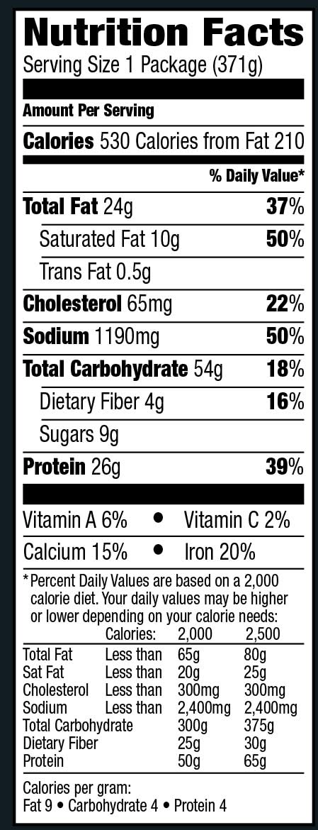 Directions for use: Cook thoroughly. For food safety & quality, follow these cooking instructions: Keep frozen until ready to use. Microwave Oven (1100-watts): 1. Remove tray from carton. Do not pierce or remove film. 2. Cook on high. 3. Stir and re-cover. 4. Cook again on high. Let stand 1 to 2 minutes. Conventional Oven: Preheat 350 degrees F. Remove tray from carton. Do not pierce or remove film. Place tray on baking sheet, center rack. Bake 30 minutes, stir and re-cover. Bake again 8 minutes. Stir and enjoy! Caution: Product will be hot. Use care when removing film as hot steam may escape. Cook thoroughly to an internal temperature of at least 165 degrees F. Ovens vary; cooking time may need adjusting. Do not prepare in toaster oven. Do not reheat tray. Keep frozen. Storage recommendation: Keep frozen.