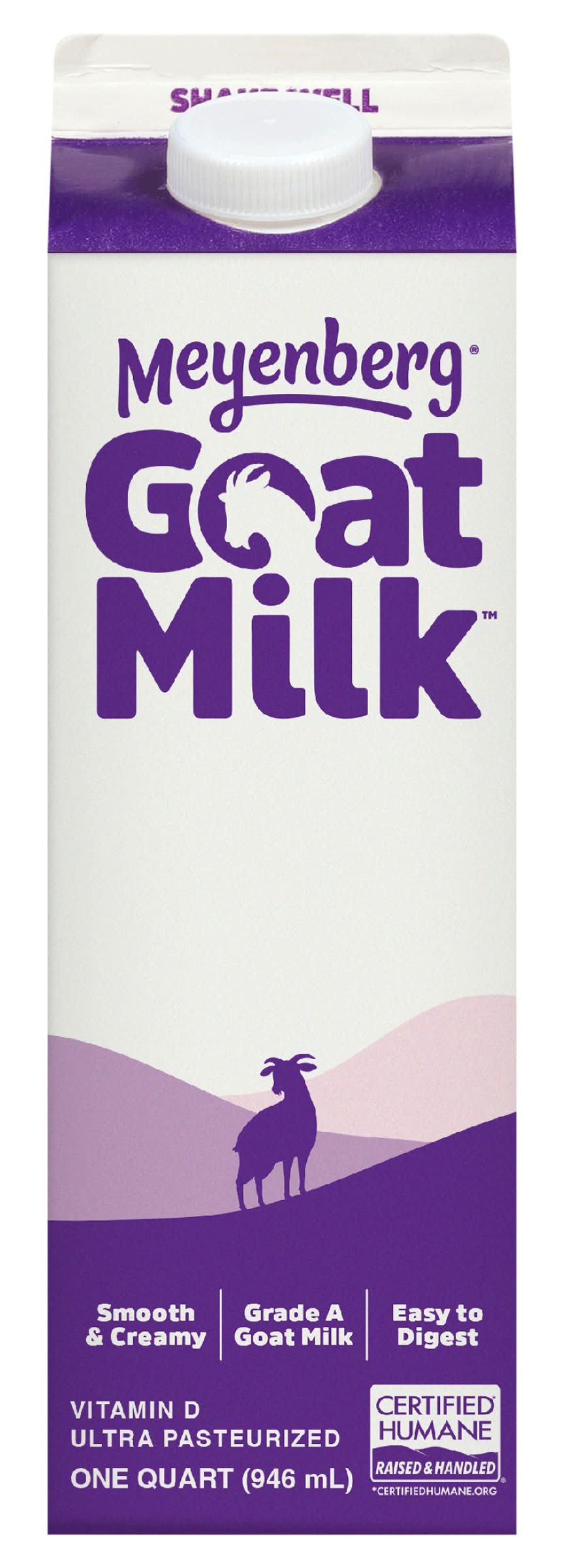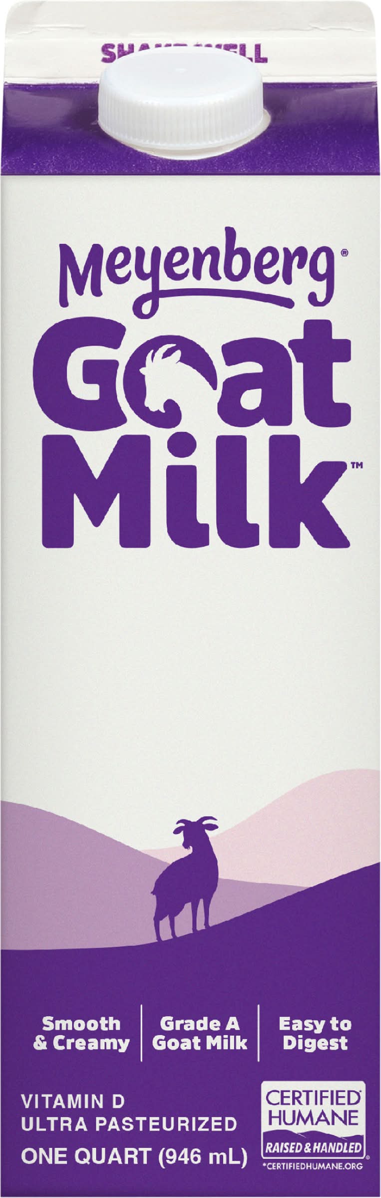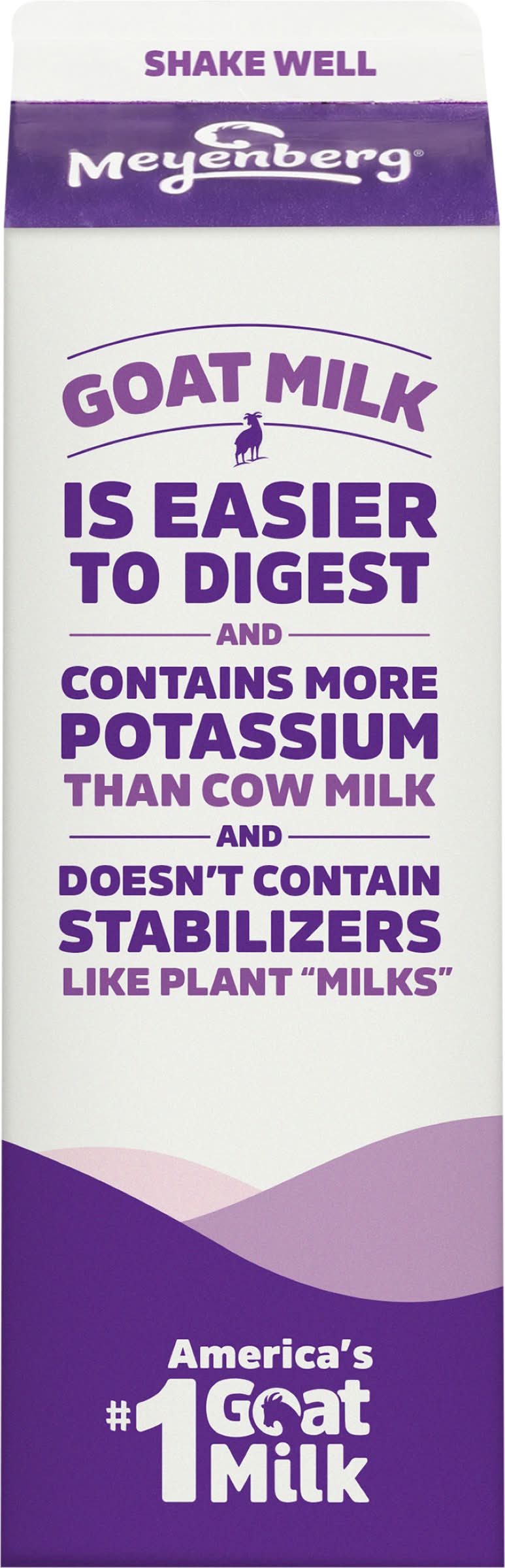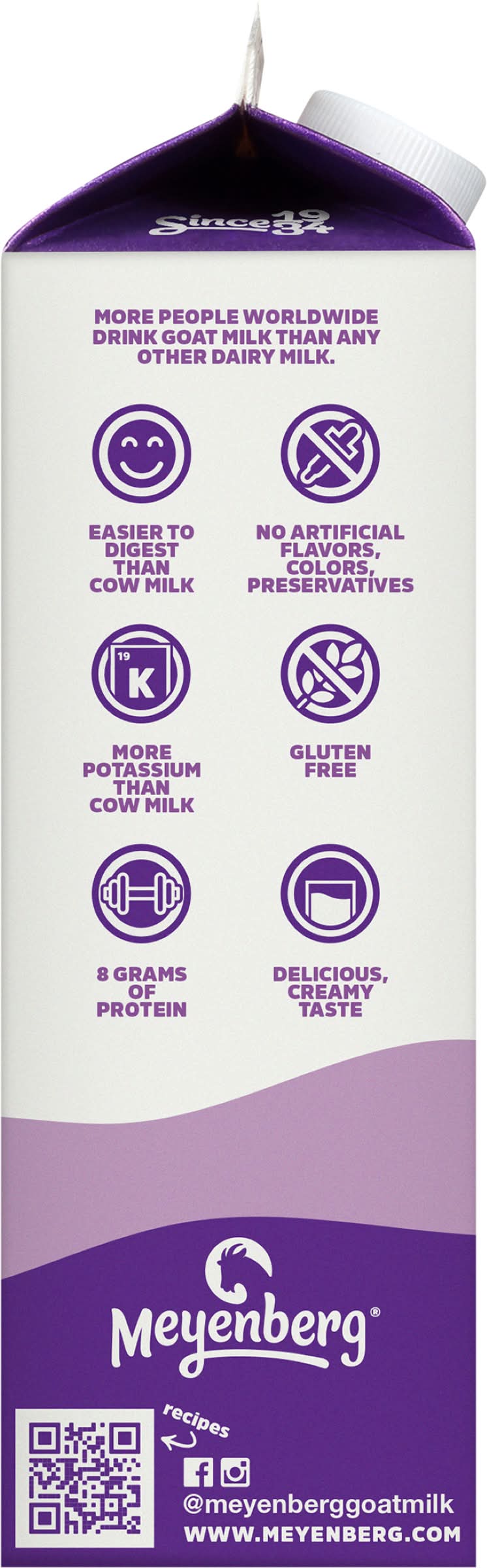 No artificial flavors, colors, preservatives. 8 grams of protein. Gluten free. Vitamin D. Smooth & creamy. Easy to digest. Ultra pasteurized. Goat milk is easier to digest and contains more potassium than cow milk and doesn't contain stabilizers like plant milks. America's No. 1 goat milk. More people worldwide drink goat milk than any other dairy milk • Meyenberg, Turlock, CA, 95381 • Packaging: Reusable