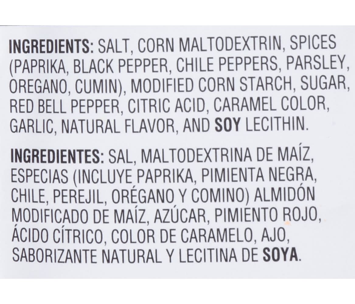 Ingredients: Salt, Corn Maltodextrin, Spices (Paprika, Black Pepper, Chile Peppers, Parsley, Oregano, Cumin), Modified Corn Starch, Sugar, Red Bell Pepper, Citric Acid, Caramel Color, Garlic, Natural Flavors, and Soy Lecithin. Contains: 'Contains Soybeans'