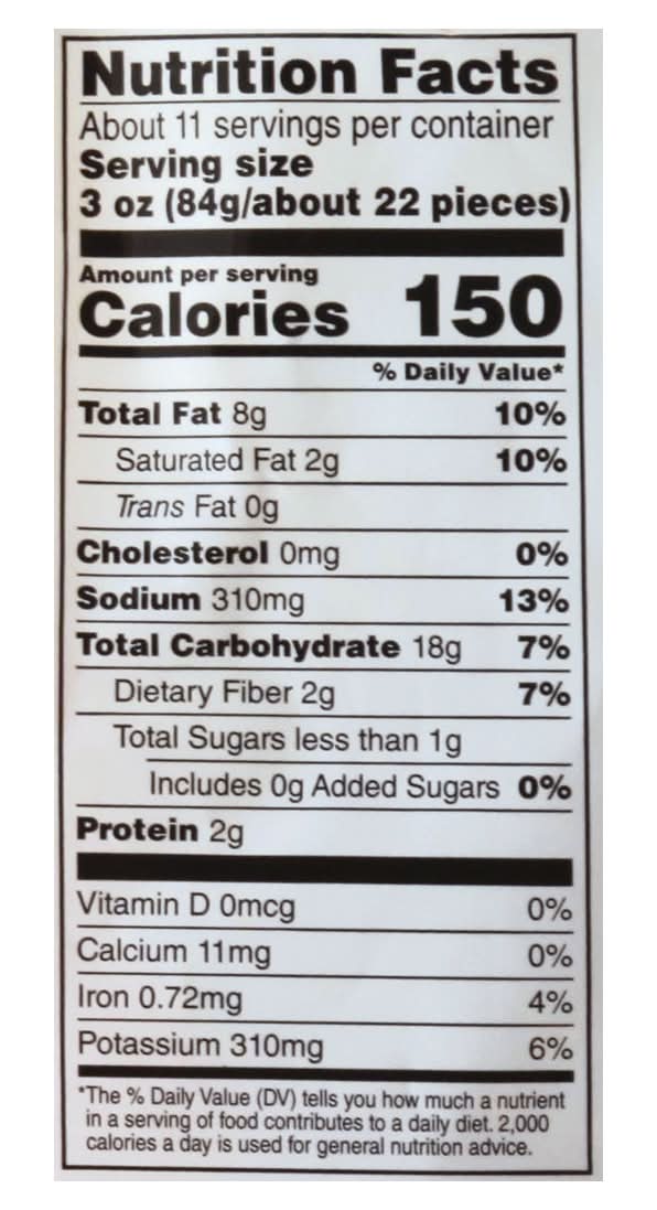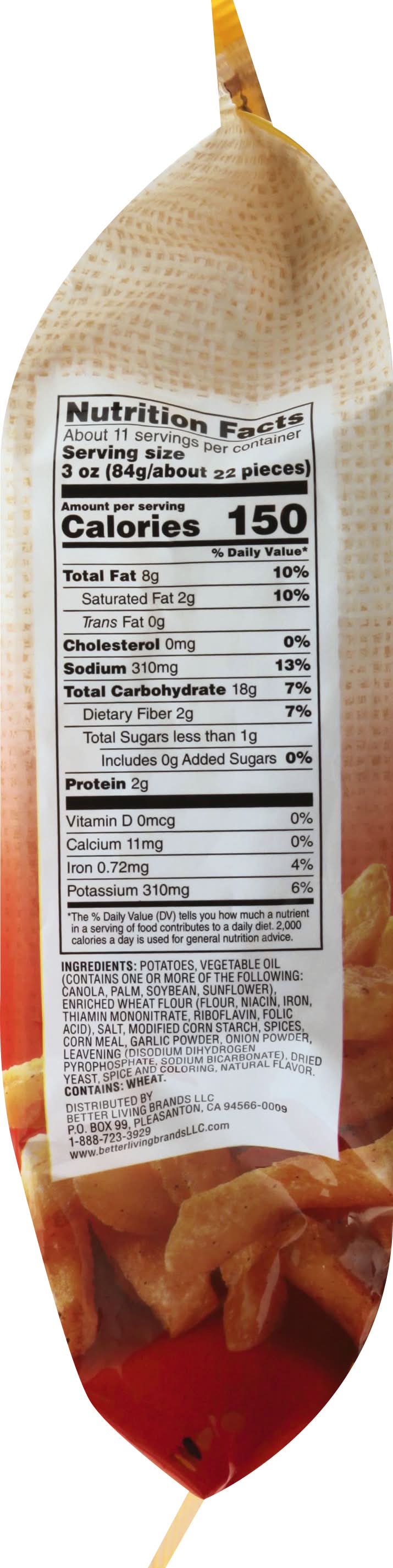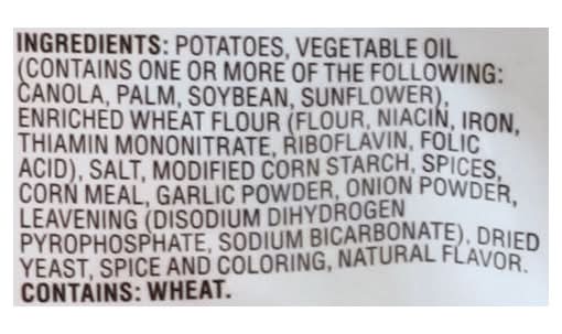 Ingredients: Potatoes, Vegetable Oil (Contains One or More of the Following: Canola, Palm, Soybean, Sunflower), Enriched Wheat Flour (Flour, Niacin, Iron, Thiamin Mononitrate, Riboflavin, Folic Acid), Salt, Modified Corn Starch, Spices, Corn Meal, Garlic Powder, Onion Powder, Leavening (Disodium Dihydrogen Pyrophosphate, Sodium Bicarbonate), Dried Yeast, Spice and Coloring, Natural Flavor. Contains: Wheat