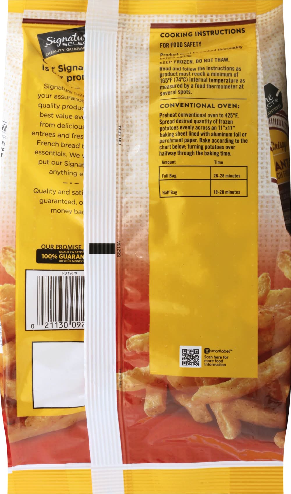 Directions for use: For Food Safety: Product must be cooked thoroughly before eating. Read and follow the instructions as product must reach a minimum of 165 degrees F (74 degrees C) internal temperature as measured by a food thermometer at several spots. Conventional Oven: Preheat conventional oven to 425 degrees F. Spread desired quantity of frozen potatoes evenly across an 11 inches x 17 inches baking sheet lined with aluminum foil or parchment paper. Bake according to the chart below; turning potatoes over halfway through the baking time. Amount: Full bag; Time: 26-28 minutes; Amount: Half bag; Time: 18-20 minutes. Storage recommendation: Keep frozen.