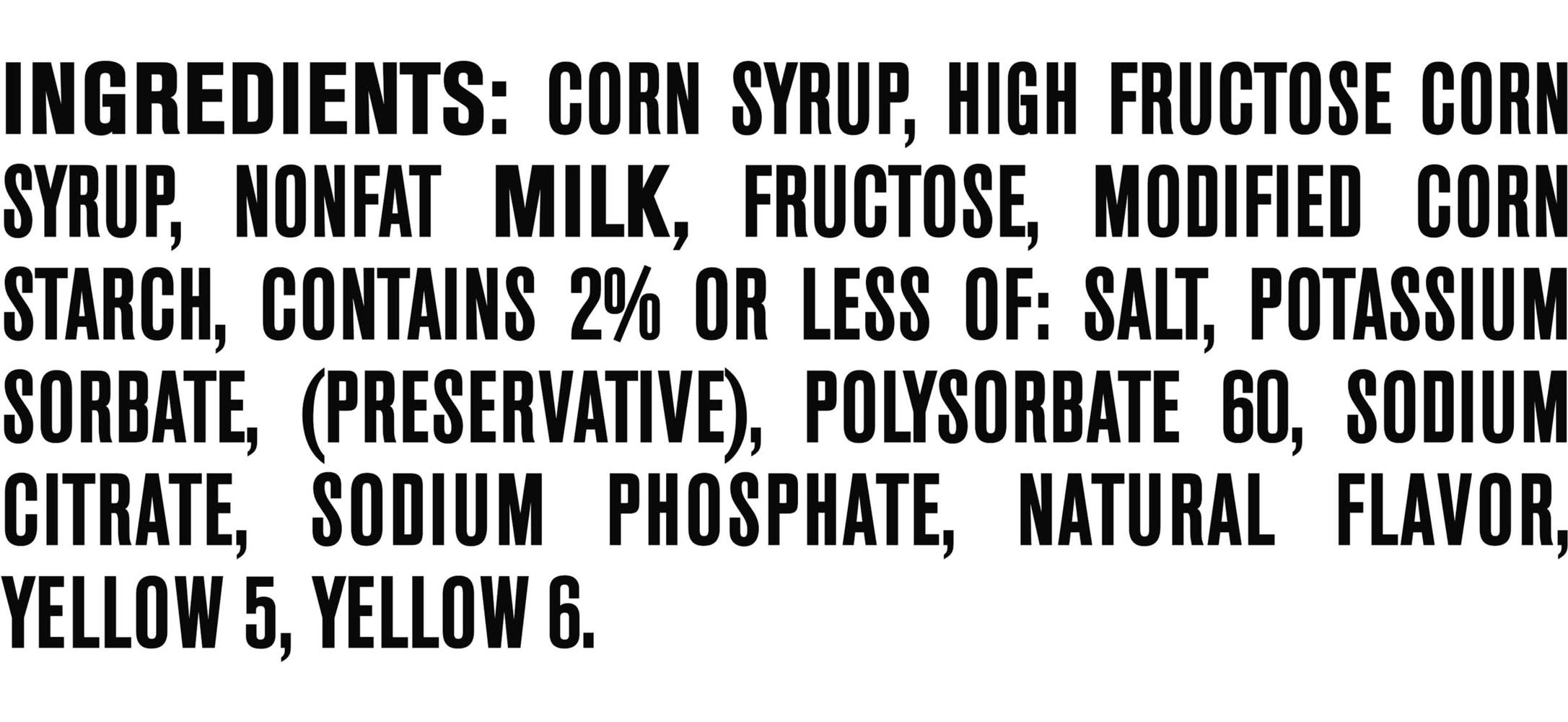 Ingredients: Corn Syrup, High Fructose Corn Syrup, Nonfat Milk, Fructose, Modified Corn Starch, Contains 2% Or Less Of: Salt, Potassium Sorbate (preservative), Polysorbate 60, Sodium Citrate, Sodium Phosphate, Natural Flavor, Yellow 5, Yellow 6. Contains: Contains Milk Ingredients.