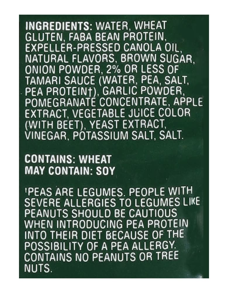 Ingredients: Water, Wheat Gluten, Faba Bean Protein Expeller-Pressed Canola Oil, Natural Flavors, Brown Sugar, Onion Powder, 2% or Less of Tamari Sauce (Water, Pea, Salt, Pea Protein(a)), Garlic Powder, Pomegranate Concentrate, Apple Extract, Vegetable Juice Color (with Beet), Yeast Extract, Vinegar, Potassium Salt, Salt. (a) Peas Are Legumes, People with Severe Allergies to Legumes Like Peanuts Should Be Cautious When Introducing Pea Protein Into Their Diet Because of the Possibility of a Pea Allergy. Contains No Peanuts or Tree Nuts Contains: Wheat, Peanuts, Gluten, Soybeans