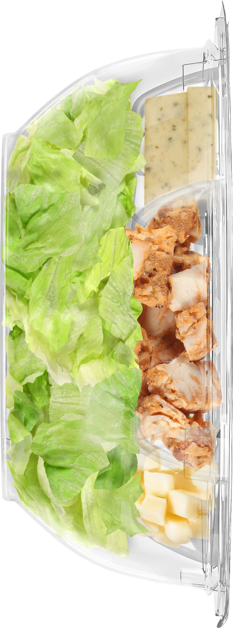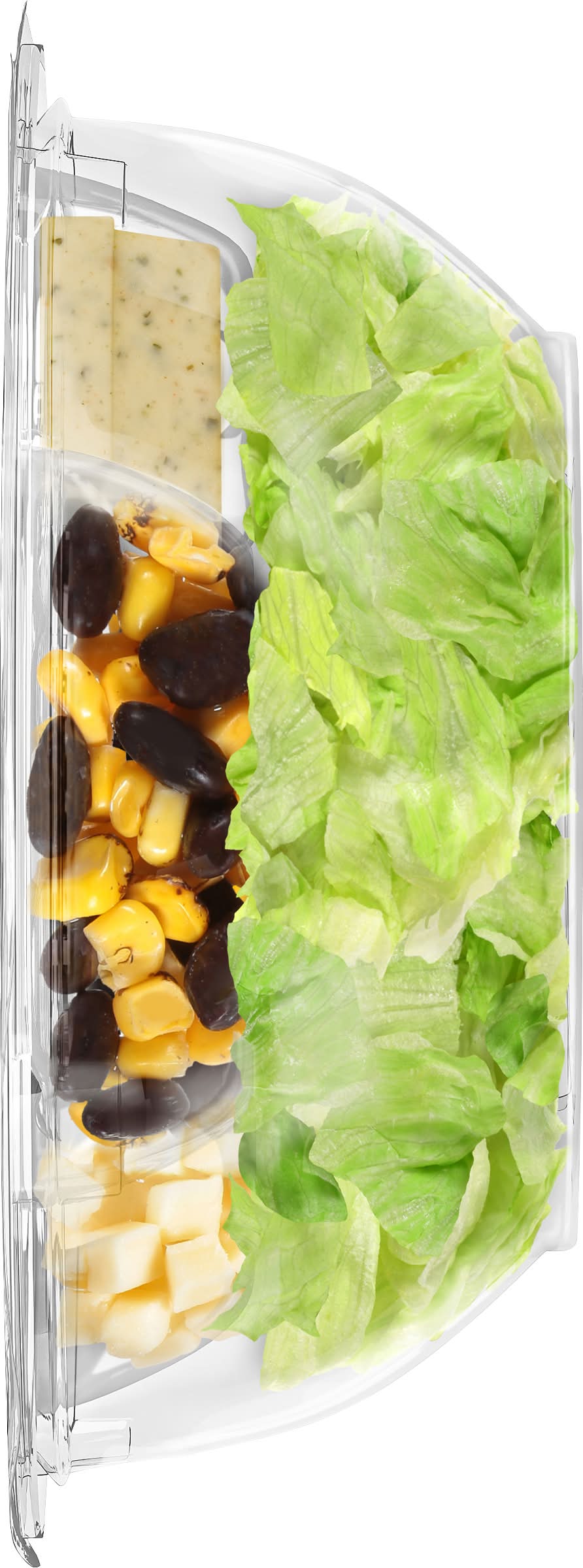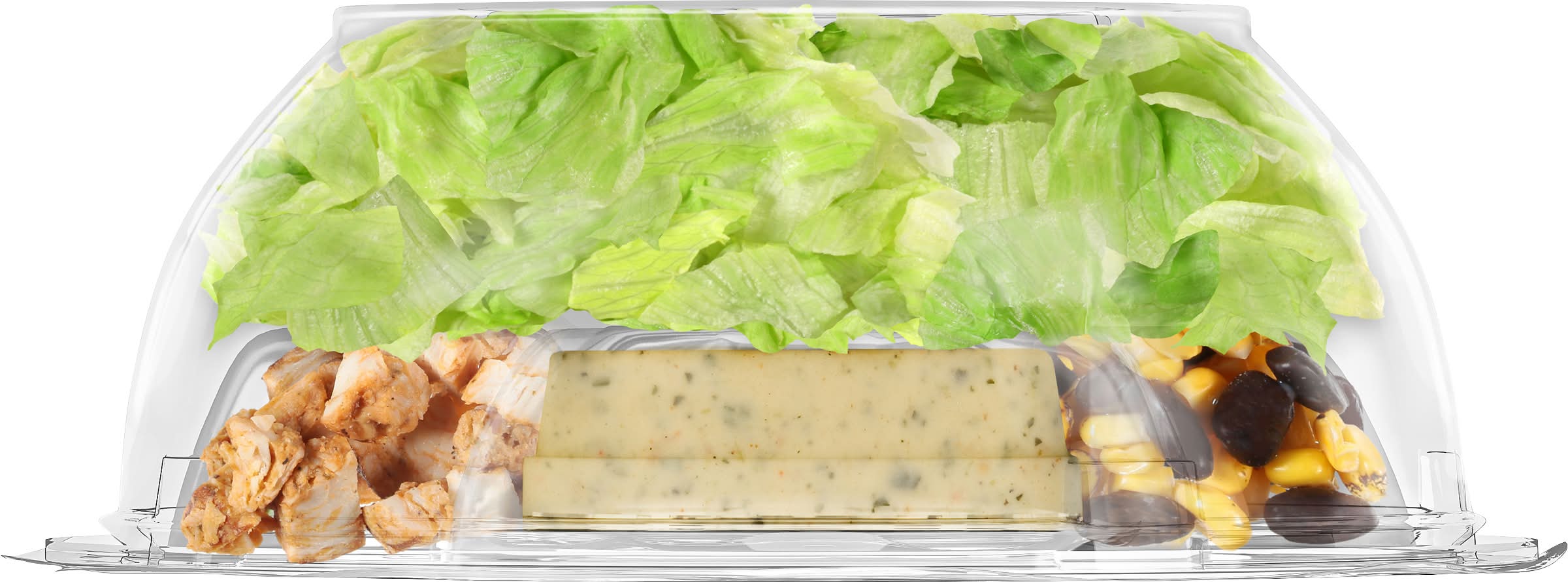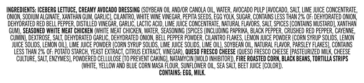 Ingredients: Iceberg Lettuce, Creamy Avocado Dressing (Soybean Oil and/or Canola Oil, Water, Avocado Pulp [Avocado, Salt, Lime Juice Concentrate, Onion, Sodium Alginate, Xanthan Gum, Garlic], Cilantro, White Wine Vinegar, Pepita Seeds, Egg Yolk, Sugar, Contains Less than 2% of: Dehydrated Onion, Dehydrated Red Bell Pepper, Distilled Vinegar, Garlic, Lactic Acid, Lime Juice Concentrate, Natural Flavors, Salt, Spices [Contains Mustard], Xanthan Gum), Seasoned White Meat Chicken (White Meat Chicken, Water, Seasoning [Spices {Including Paprika, Black Pepper, Crushed Red Pepper, Cayenne, Cumin}, Dextrose, Salt, Dehydrated Garlic, Dehydrated Onion, Bell Pepper Powder, Cilantro Flakes, Lemon Juice Powder {Corn Syrup Solids, Lemon Juice Solids, Lemon Oil}, Lime Juice Powder {Corn Syrup Solids, Lime Juice Solids, Lime Oil}, Soybean Oil, Natural Flavor, Parsley Flakes], Contains Less than 2% of: Potato Starch, Yeast Extract, Citrus Extract, Vinegar), Queso Fresco Cheese (Queso Fresco Cheese [Pasteurized Milk, Cheese, Culture, Salt, Enzymes], Powdered Cellulose [to Prevent Caking], Natamycin [Mold Inhibitor]), Fire Roasted Corn, Black Beans, Tortilla Strips (White, Yellow and Blue Corn Masa Flour, Sunflower Oil, Sea Salt, Beet Juice [Color]) Contains: Eggs, Milk, Soybeans, Mustard