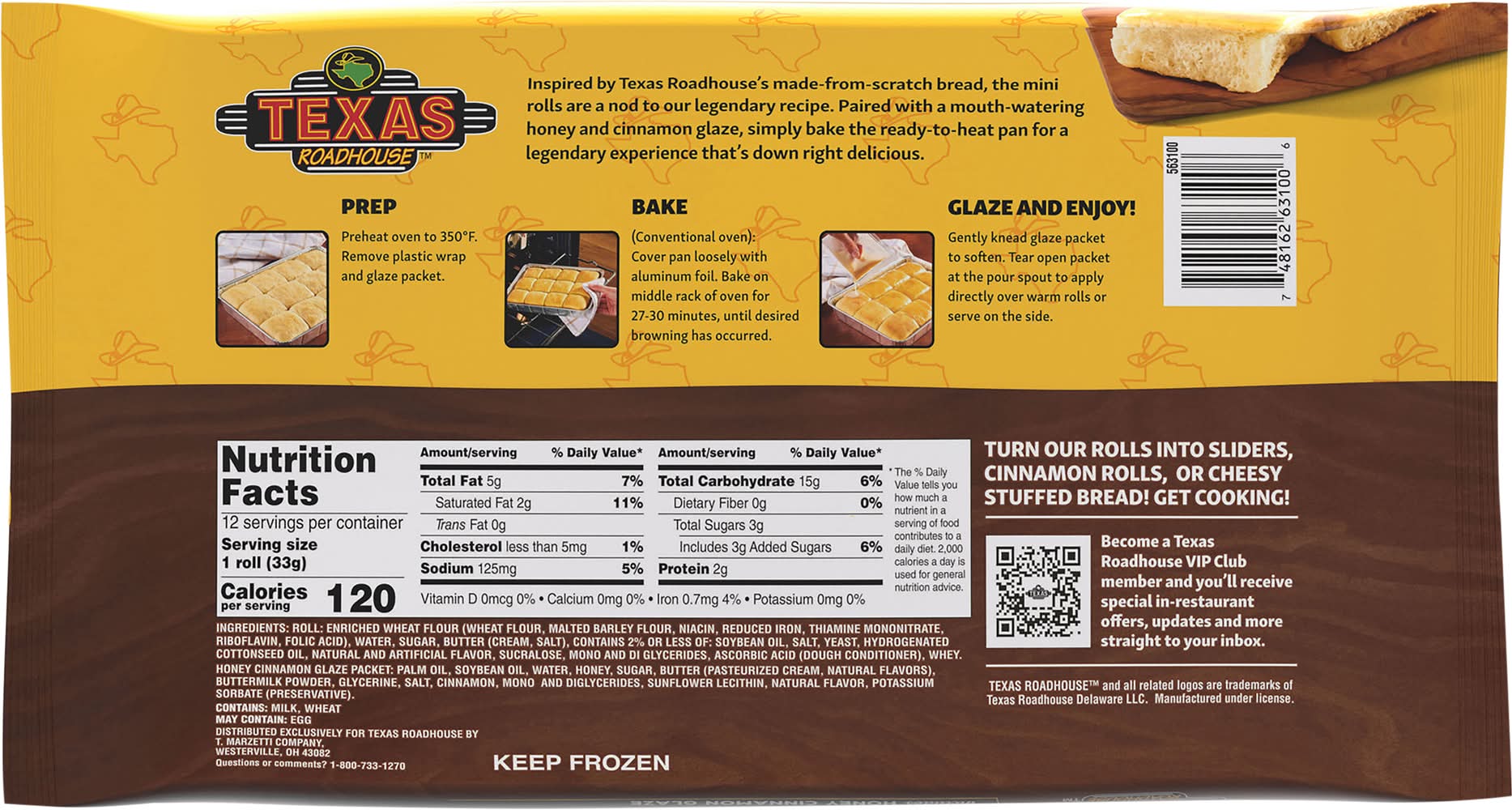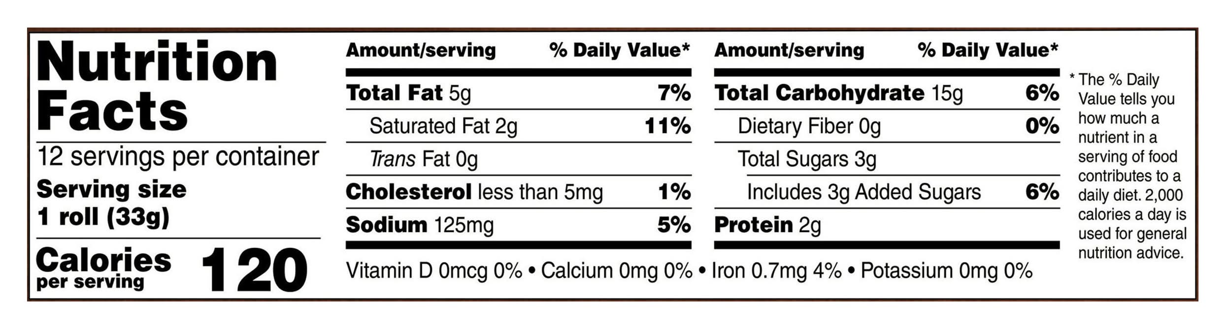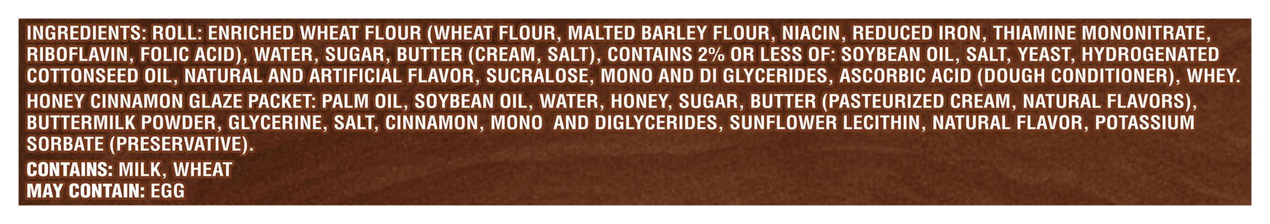 Ingredients: Roll: Enriched Wheat Flour (Wheat Flour, Malted Barley Flour, Niacin, Reduced Iron, Thiamine Mononitrate, Riboflavin, Folic Acid), Water, Sugar, Butter (Cream, Salt), Contains 2% or Less of: Soybean Oil, Salt, Yeast, Hydrogenated Cottonseed Oil, Natural and Artificial Flavor, Sucralose, Mono and Di Glycerides, Ascorbic Acid (Dough Conditioner), Whey. Honey Cinnamon Glaze Packet: Palm Oil, Soybean Oil, Water, Honey, Sugar, Butter (Pasteurized Cream, Natural Flavors), Buttermilk Powder, Glycerine, Salt, Cinnamon, Mono and Diglycerides, Sunflower Lecithin, Natural Flavor, Potassium Sorbate (Preservative) Contains: Milk, Wheat, Barley, Soybeans, Eggs