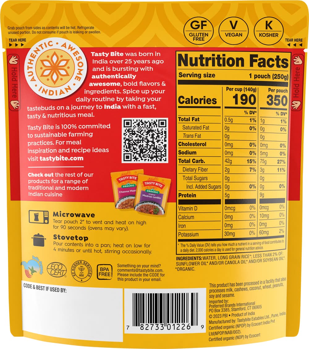Tasty Bite Organic Steamed White Sticky Rice, Restaurant-Style (8.8 oz)