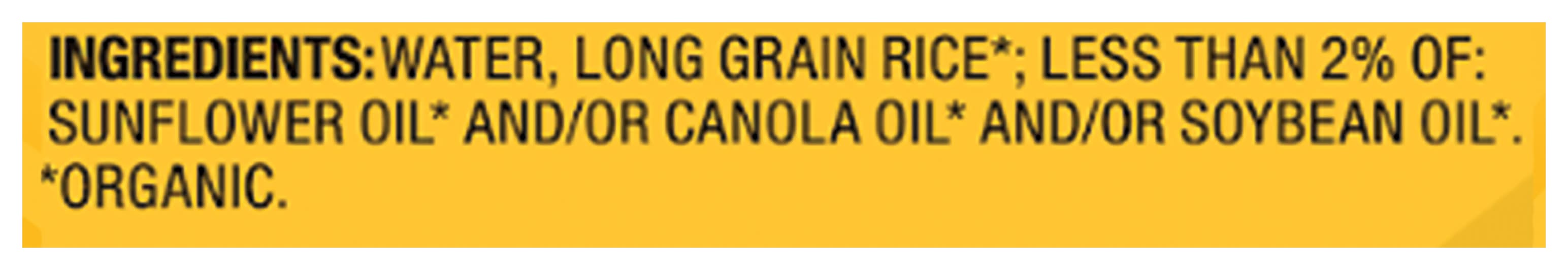 Ingredients: Water, Long Grain Rice (Organic); Less than 2% of: Sunflower Oil (Organic) and/or Canola Oil (Organic) and/or Soybean Oil (Organic) Contains: Soybeans, Milk, Tree Nuts, Cashews, Tree Nuts, Coconuts, Wheat, Peanuts, Sesame