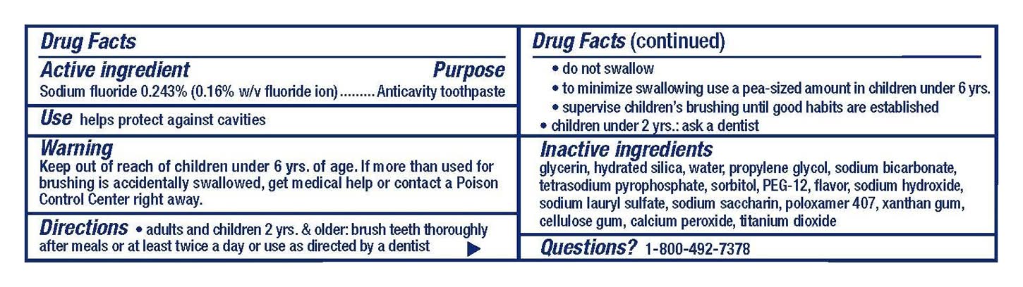Ingredients: Active Ingredients: Sodium Fluoride 0.16% w/v Fluoride Ion 0.243 %, Anticavity Toothpaste. Inactive Ingredients: Glycerin, Hydrated Silica, Water, Propylene Glycol, Sodium Bicarbonate, Tetrasodium Pyrophosphate, Sorbitol, PEG-12, Flavor, Sodium Hydroxide, Sodium Lauryl Sulfate, Sodium Saccharin, Poloxamer 407, Xanthan Gum, Cellulose Gum, Calcium Peroxide, Titanium Dioxide, Blue 1. Additives: Inactive Ingredients: Glycerin, Hydrated Silica, Water, Propylene Glycol, Sodium Bicarbonate, Tetrasodium Pyrophosphate, Sorbitol, PEG-12, Flavor, Sodium Hydroxide, Sodium Lauryl Sulfate, Sodium Saccharin, Poloxamer 407, Xanthan Gum, Cellulose Gum, Calcium Peroxide, Titanium Dioxide, Blue 1.