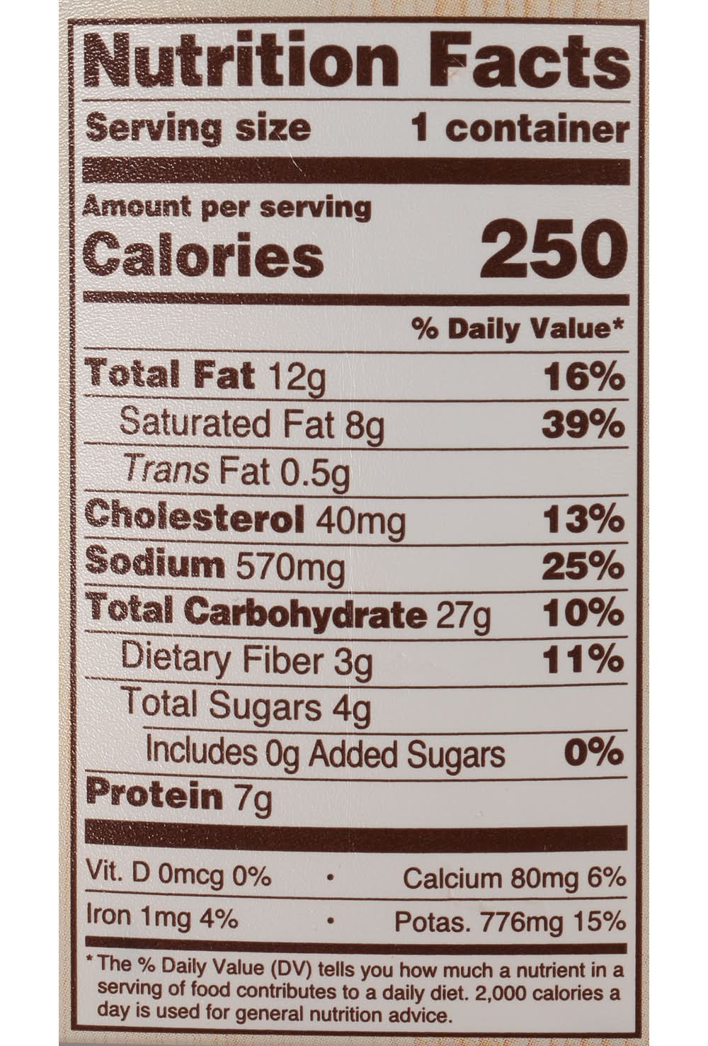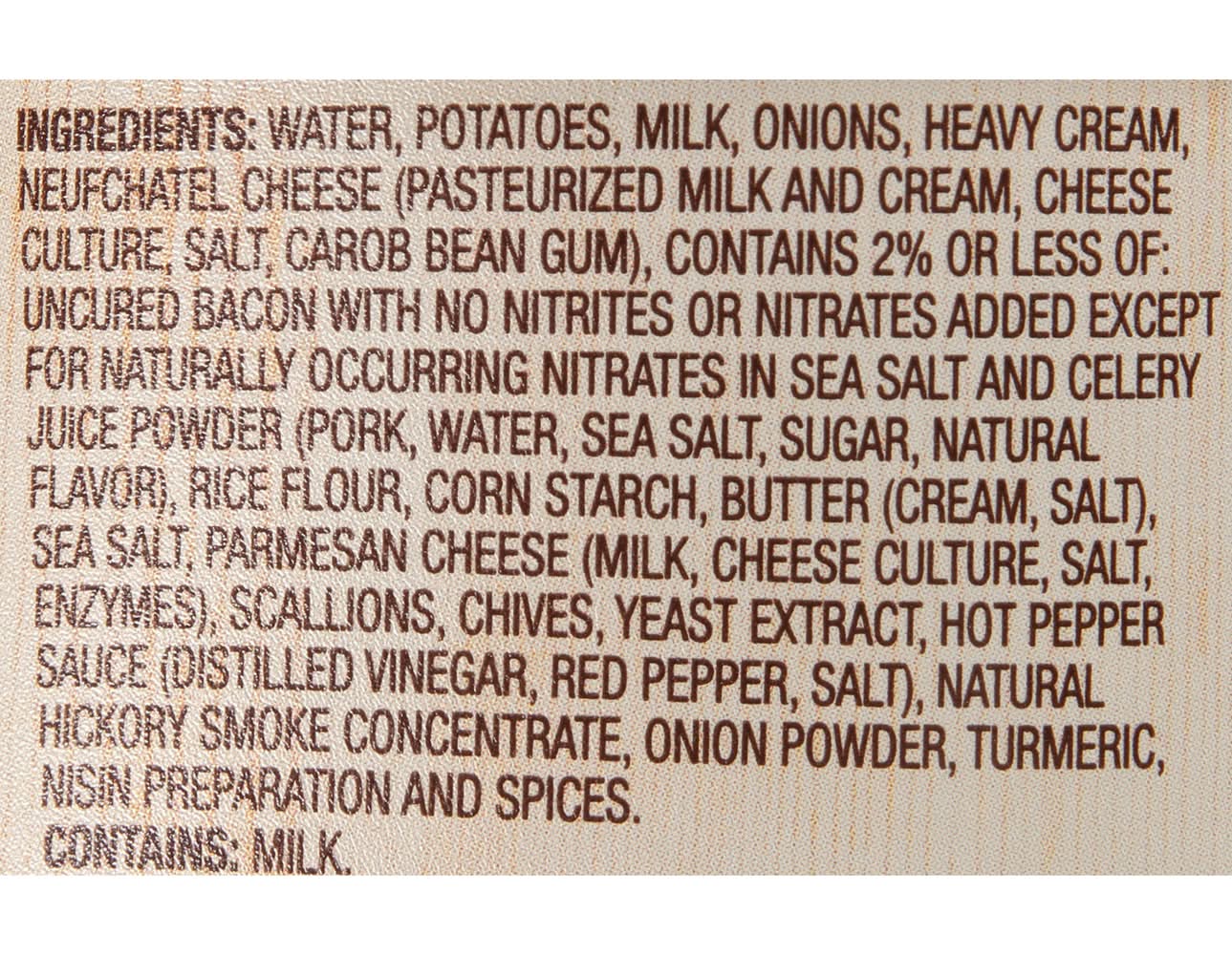 Ingredients: Water, Potatoes, Milk, Onions, Heavy Cream, Neufchatel Cheese (Pasteurized Milk and Cream, Cheese Culture, Salt, Carob Bean Gum), Contains 2% or Less of: Uncured Bacon with No Nitrites or Nitrates Added Except for Naturally Occurring Nitrates in Sea Salt and Celery Juice Powder (Pork, Water, Sea Salt, Sugar, Natural Flavor), Rice Flour, Corn Starch, Butter (Cream, Salt), Sea Salt, Parmesan Cheese (Milk, Cheese Culture, Salt, Enzymes), Scallions, Chives, Yeast Extract, Hot Pepper Sauce (Distilled Vinegar, Red Pepper, Salt), Natural Hickory Smoke Concentrate, Onion Powder, Turmeric, Nisin Preparation and Spices Contains: Milk
