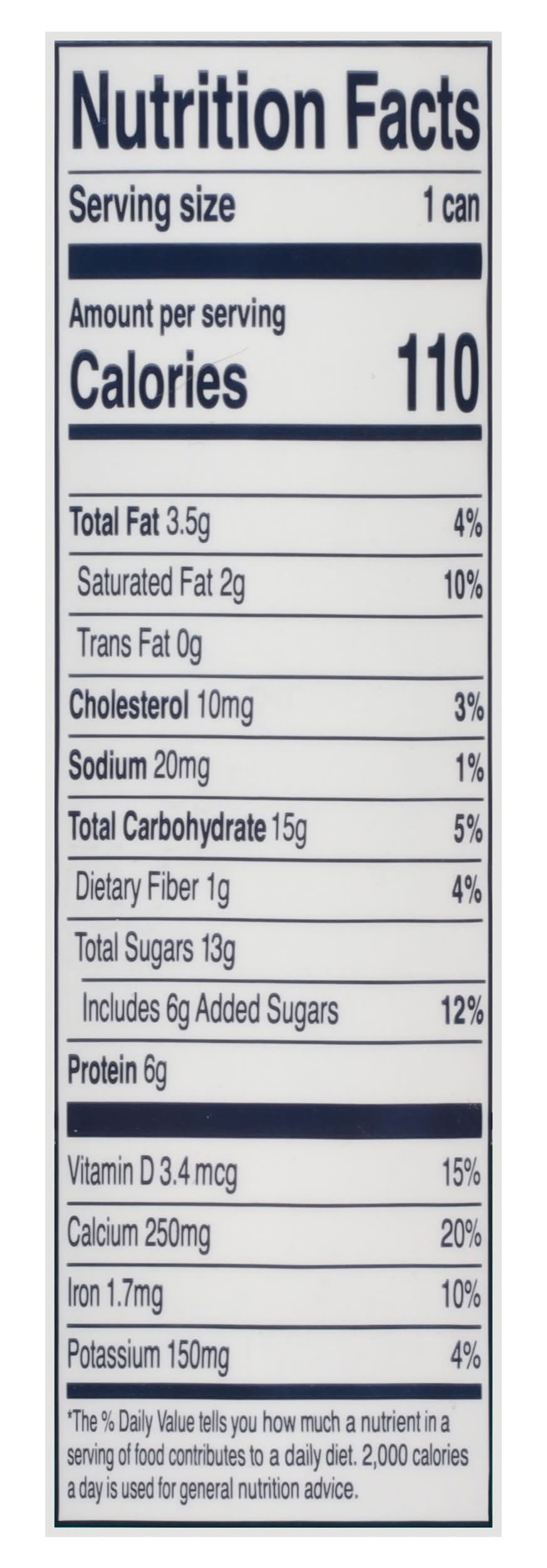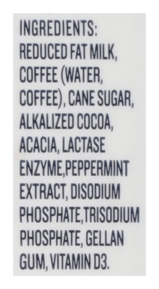 Ingredients: Reduced Fat Milk, Coffee (Water, Coffee), Cane Sugar, Alkalized Cocoa, Acacia, Lactase Enzyme, Peppermint Extract, Disodium Phosphate, Trisodium Phosphate, Gellan Gum, Vitamin D3 Contains: Milk