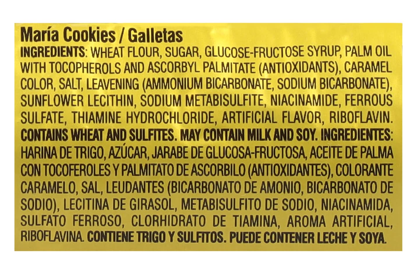 Ingredients: Wheat Flour, Sugar, Glucose-Fructose Syrup, Palm Oil with Tocopherols and Ascorbyl Palmitate (Antioxidants), Caramel Color, Salt, Leavening (Ammonium Bicarbonate, Sodium Bicarbonate), Sunflower Lecithin, Sodium Metabisulfite, Niacinamide, Ferrous Sulfate, Thiamine Hydrochloride, Artificial Flavor, Riboflavin Contains: Wheat, Sulfites, Milk, Soybeans