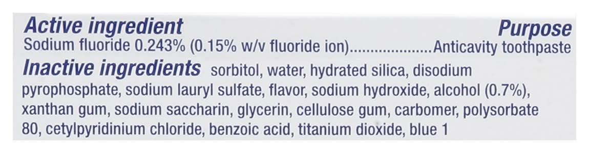 Ingredients: Active Ingredients: Sodium Fluoride (0.15% w/v Fluoride Ion) (0.243 %), Anticavity Toothpaste. Inactive Ingredients: Sorbitol, Water, Hydrated Silica, Disodium Pyrophosphate, Flavor, Sodium Lauryl Sulfate, Sodium Hydroxide, Alcohol (0.7%), Xanthan Gum, Sodium Saccharin, Glycerin, Cellulose Gum, Carbomer, Polysorbate 80, Cetylpyridinium Chloride, Benzoic Acid, Titanium Dioxide, Blue 1