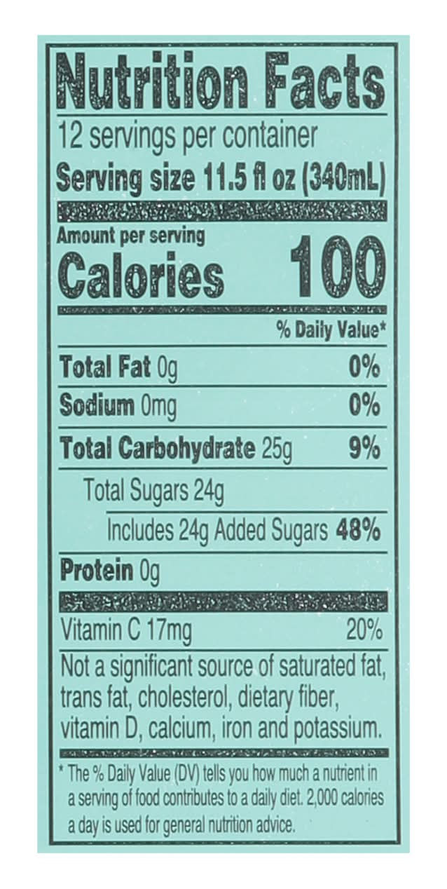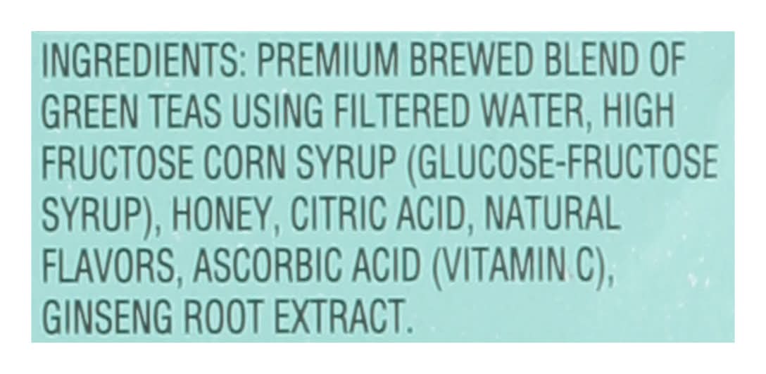 Ingredients: Premium Brewed Blend of Green Teas Using Filtered Water, High Fructose Corn Syrup (Glucose-Fructose Syrup), Honey, Citric Acid, Natural Flavors, Ascorbic Acid (Vitamin C), Ginseng Root Extract Contains: Corn