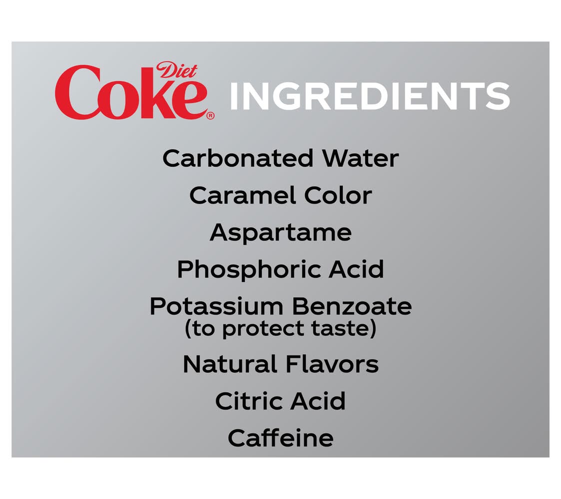 Ingredients: Carbonated Water, Caramel Color, Aspartame, Phosphoric Acid, Potassium Benzoate (to Protect Taste), Natural Flavors, Citric Acid, Caffeine.