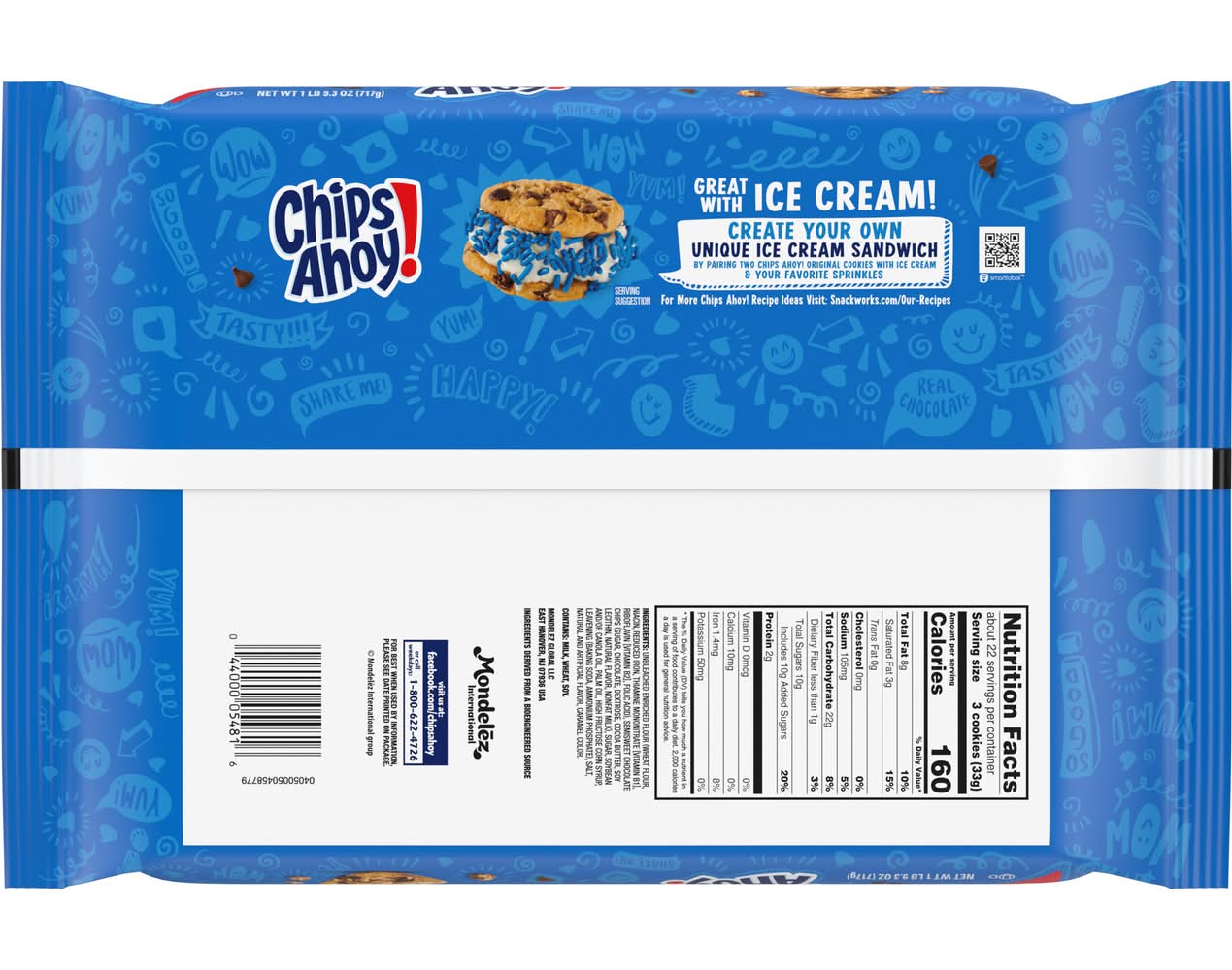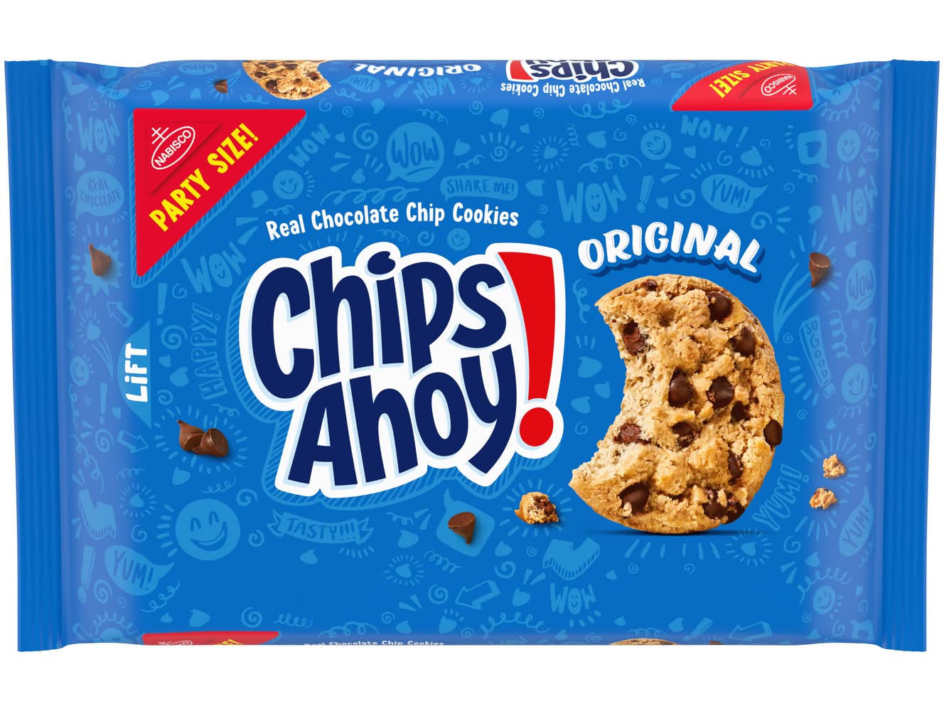 Original Chocolate Chip Cookies are the CHIPS AHOY! cookies you know and love, baked to have the perfect amount of crunch. These crispy chocolate chip cookies are loaded with lots of real chocolate chips. Enjoy the comforting taste of these classic cookies that are sure to become a household favorite. Make lunches at school or work more exciting by including chocolate chip cookies, or grab a pack and create delicious chocolate chip cookie desserts for your next holiday party or gathering. Regardless of the occasion these cookies make a simple treat you can enjoy on their own with milk, as an ice cream topper, or to make ice cream sandwiches or desserts. The resealable lift tab makes this package of snack cookies easy to open and close for convenient storage. Party Size Mondelez Global LLC, East Hanover, NJ, 07936