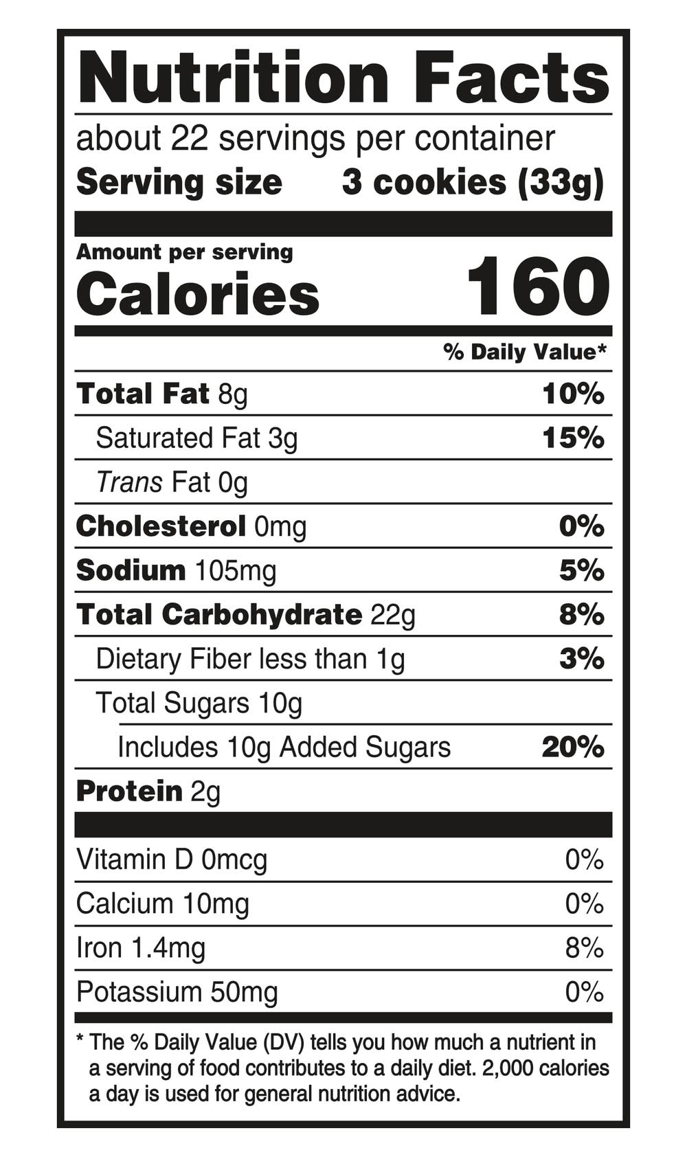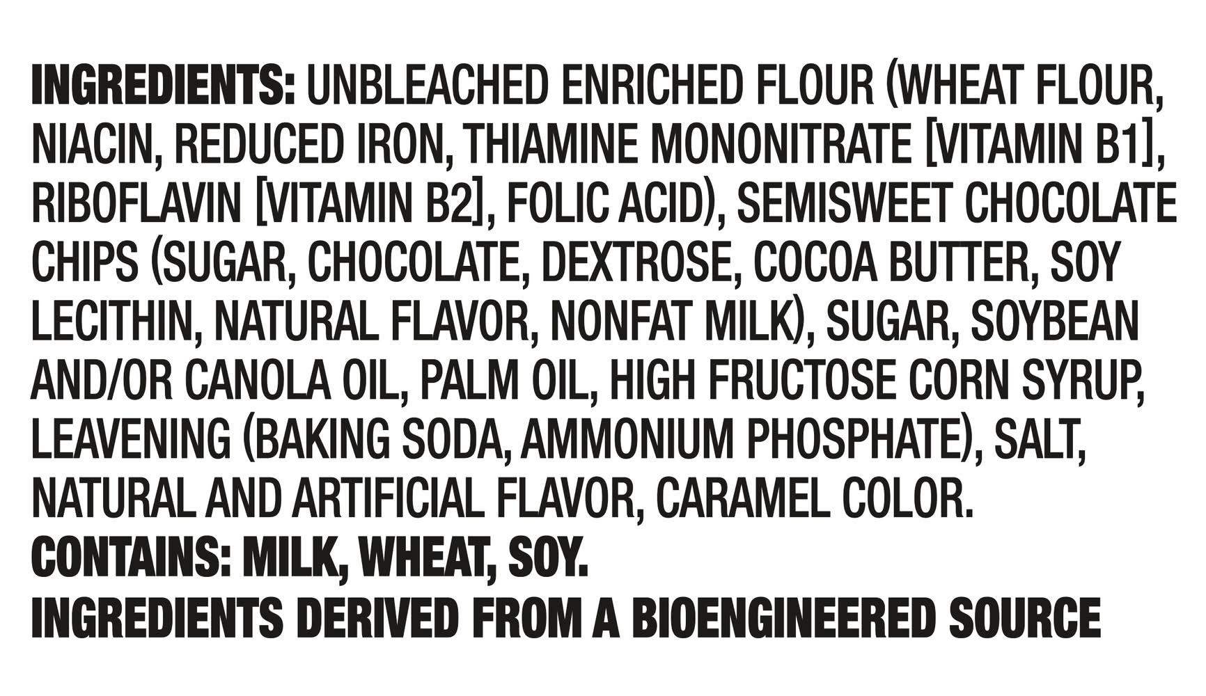Ingredients: Unbleached Enriched Flour (Wheat Flour, Niacin, Reduced Iron, Thiamine Mononitrate [Vitamin B1], Riboflavin [Vitamin B2], Folic Acid), Semisweet Chocolate Chips (Sugar, Chocolate, Dextrose, Cocoa Butter, Soy Lecithin, Natural Flavor, Nonfat Milk), Sugar, Soybean and/or Canola Oil, Palm Oil, High Fructose Corn Syrup, Leavening (Baking Soda, Ammonium Phosphate), Salt, Natural and Artificial Flavor, Caramel Color Contains: Milk, Soybeans, Wheat, Corn