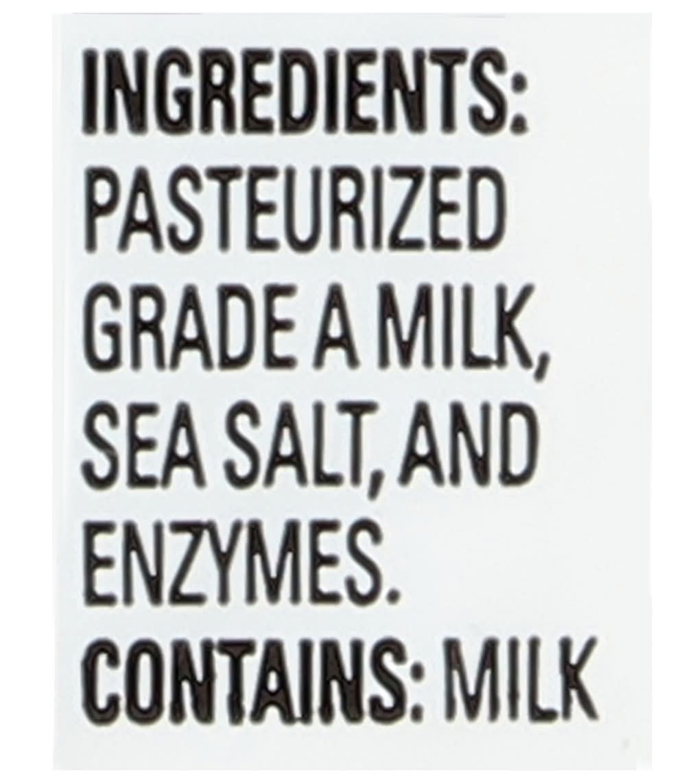 Ingredients: Pasteurized Grade A Milk, Sea Salt, and Enzymes Contains: Milk