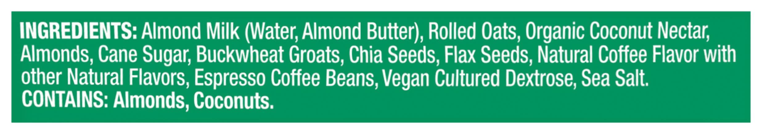 Ingredients: Almond Milk (Water, Almond Butter), Rolled Oats, Organic Coconut Nectar, Almonds, Cane Sugar, Buckwheat Groats, Chia Seeds, Flax Seeds, Natural Coffee Flavor with Other Natural Flavors, Espresso Coffee Beans, Vegan Cultured Dextrose, Sea Salt Contains: Tree Nuts, Almonds, Tree Nuts, Coconuts, Oat