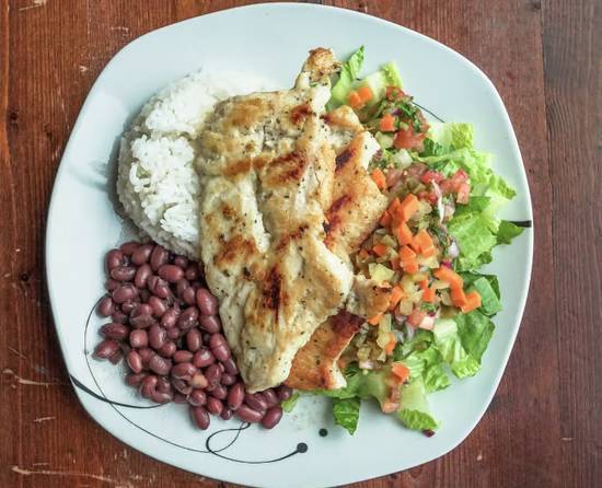 Pechuga asada, arve blanco. Of gallo pinto, tajada de platano verole y ensalada de repollo.