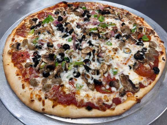 Pepperoni, sausage, ham, ground beef, onion, green peppers, mashrooms, and olives.