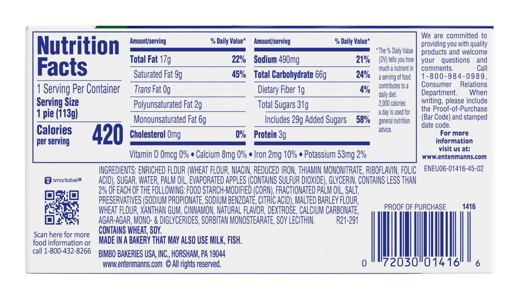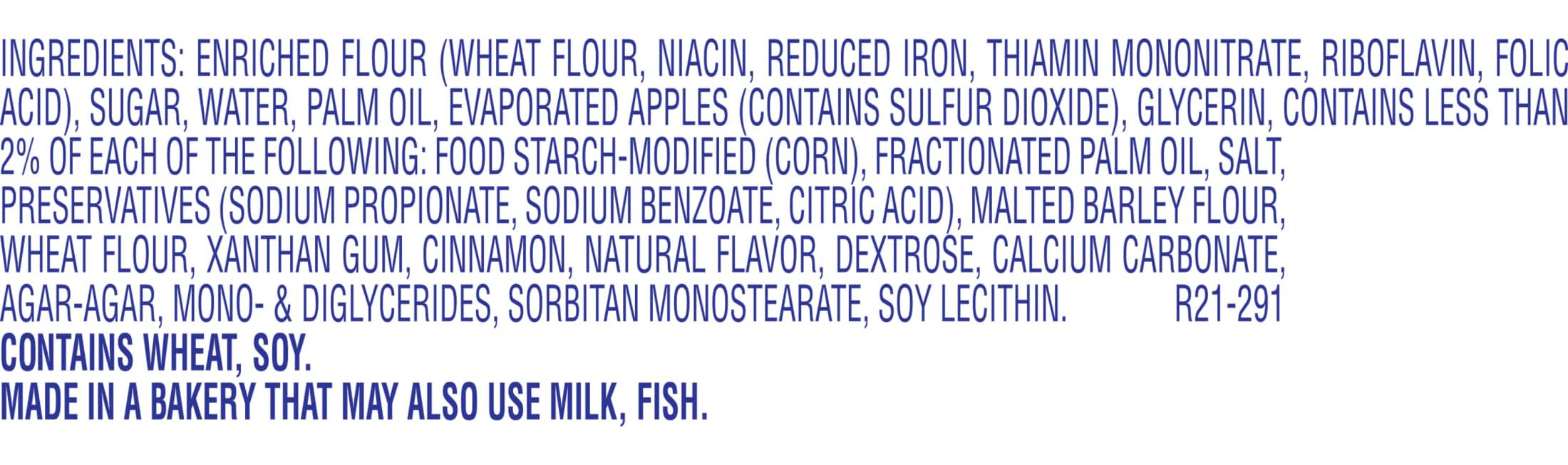 Ingredients: ENRICHED FLOUR [WHEAT FLOUR, NIACIN, REDUCED IRON, THIAMIN MONONITRATE, RIBOFLAVIN, FOLIC ACID], SUGAR, WATER, PALM OIL, EVAPORATED APPLES (CONTAINS SULFUR DIOXIDE), GLYCERIN, CONTAINS 2% OR LESS OF EACH OF THE FOLLOWING:, FOOD STARCH-MODIFIED (CORN), FRACTIONATED PALM OIL, SALT, PRESERVATIVES [SODIUM PROPIONATE, SODIUM BENZOATE, CITRIC ACID], MALTED BARLEY FLOUR, WHEAT FLOUR, XANTHAN GUM, CINNAMON, NATURAL FLAVOR, DEXTROSE, CALCIUM CARBONATE, AGAR-AGAR, MONO- DIGLYCERIDES, SORBITAN MONOSTEARATE, SOY LECITHIN, . Contains: CONTAINS SOY, WHEAT.