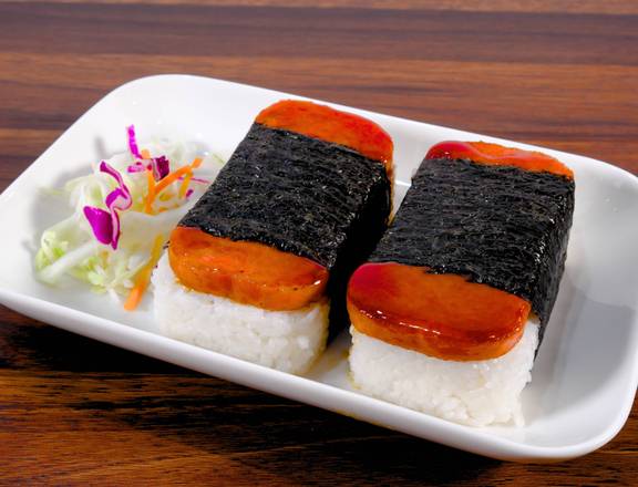Grilled teriyaki glazed spam wrapped with nori on top of rice.