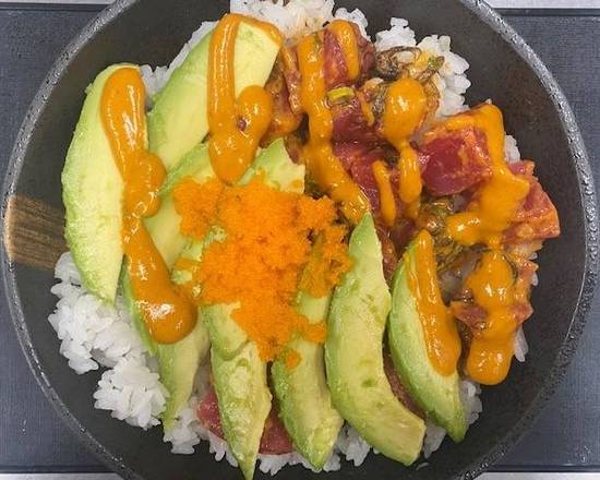 Sushi-grade tuna served over a bed of rice with a spicy kick.