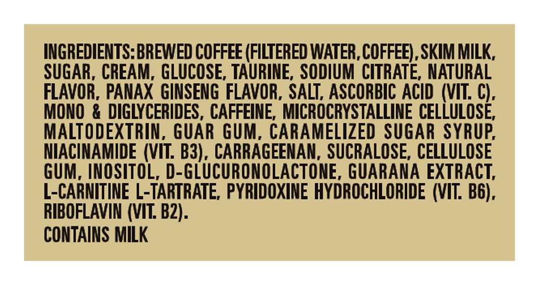 Ingredients: Brewed Coffee (Filtered Water, Coffee), Skim Milk, Sugar, Cream, Glucose, Taurine, Sodium Citrate, Natural Flavor, Panax Ginseng Flavor, Salt, Ascorbic Acid (Vit. C), Mono & Diglycerides, Caffeine, Microcrystalline Cellulose, Maltodextrin, Guar Gum, Caramelized Sugar Syrup, Niacinamide (Vit. B3), Carrageenan, Sucralose, Cellulose Gum, Inositol, D-Glucuronolactone, Guarana Extract, L-Carnitine L-Tartrate, Pyridoxine Hydrochloride (Vit. B6), Riboflavin (Vit. B2) Contains: Milk Contains 200mg of caffeine