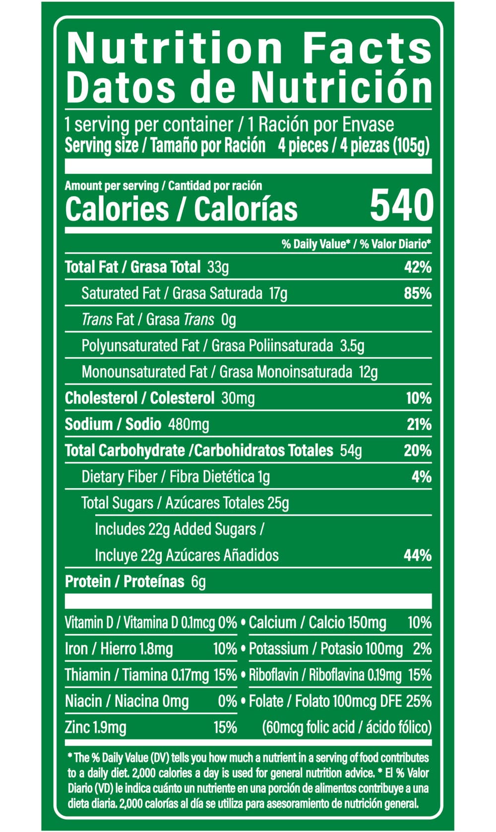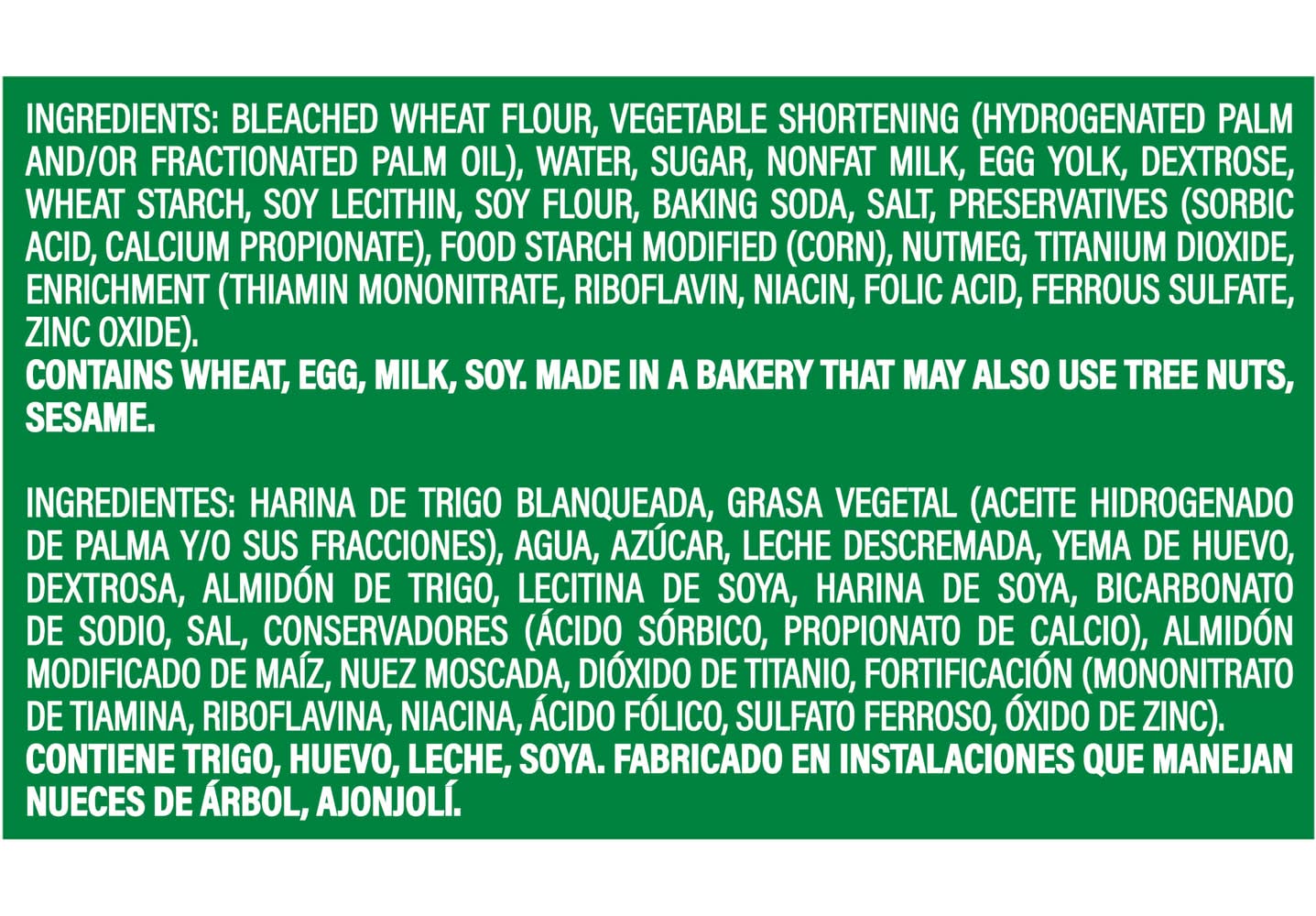 Ingredients: BLEACHED WHEAT FLOUR, VEGETABLE SHORTENING [HYDROGENATED PALM AND/OR FRACTIONATED PALM OIL], WATER, SUGAR, NONFAT MILK, EGG YOLK, DEXTROSE, WHEAT STARCH, SOY LECITHIN, SOY FLOUR, BAKING SODA, SALT, PRESERVATIVES [SORBIC ACID, CALCIUM PROPIONATE], FOOD STARCH-MODIFIED (CORN), NUTMEG, TITANIUM DIOXIDE, ENRICHMENT [THIAMIN MONONITRATE, RIBOFLAVIN, NIACIN, FOLIC ACID, FERROUS SULFATE, ZINC OXIDE], . Contains: CONTAINS EGG, MILK, SOY, WHEAT.