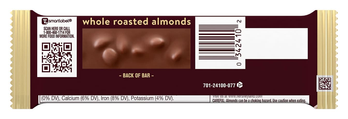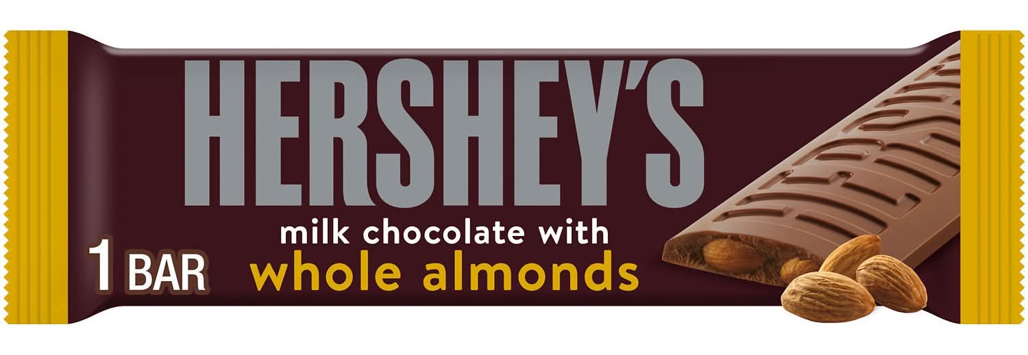 There's happy, and then there's HERSHEY'S happy. Made of the delectable, creamy milk chocolate that's been a classic for decades, HERSHEY'S milk chocolate with almond bars make life more delicious. We won't blame you if you prefer to enjoy these sweet treats alone, but they're also great to share with the people you love the most. This full size milk chocolate bar is the perfect treat for countless special and everyday occasions. HERSHEY'S milk chocolate candy bars with whole almonds can be used as a sweet treat to stuff in Christmas stockings, Halloween trick or treat bags, Easter eggs and Valentine's Day party favors. Keep some on hand for guests, and store a few in your pantry for convenient snacking when the mood strikes. Show up to movie night with a HERSHEY'S milk chocolate bar with whole almonds to share with attendees and please the whole crowd. You could also pop pieces of this chocolate bar into a bowl of popcorn for a sweet and salty combo. Or, sweeten up your favorite homemade recipes by using these milk chocolate almond bars on top of freshly baked cakes, cookies and cupcakes. Everyone is excited when they're reaching for HERSHEY'S milk chocolate with almonds, and now you can be too! Packaging: Reusable