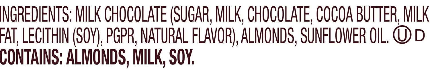 Ingredients: MILK CHOCOLATE (SUGAR, MILK, COCOA BUTTER, MILK FAT, LECITHIN (SOY), PGPR, ALMONDS, SUNFLOWER OIL., NATURAL FLAVOR Contains: Milk, Soybeans, Tree Nuts