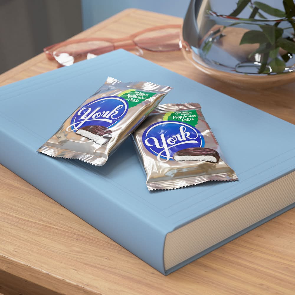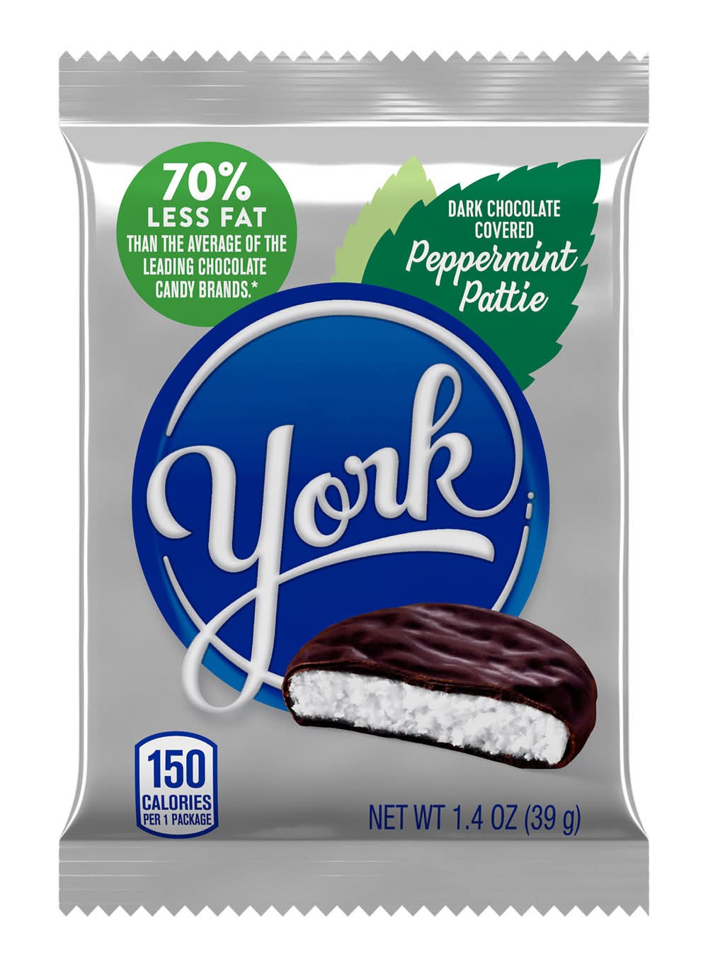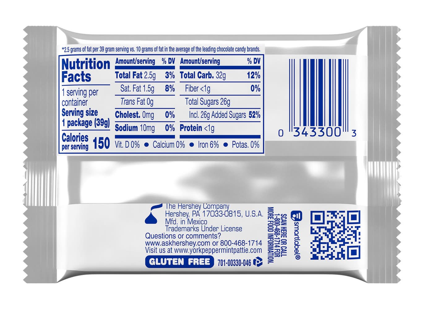 Dark chocolate covered peppermint pattie. 150 calories per package. Gluten free. 70% less fat than the average of the leading chocolate candy brands (25 grams of fat per 39 gram per serving vs. 10 grams of fat in average of the leading chocolate candy brands) • Flavor: Peppermint-dark chocolate • The Hershey Company, Hershey,PA