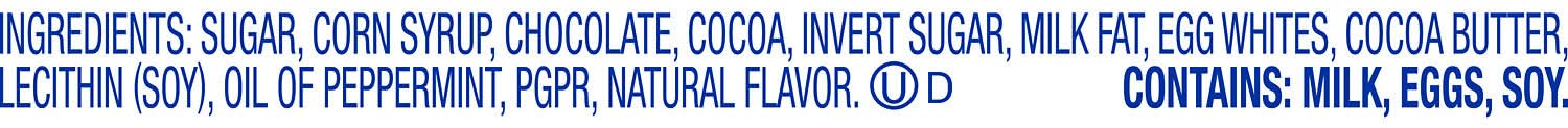Ingredients: SUGAR, CORN SYRUP, CHOCOLATE, COCOA, INVERT SUGAR, MILK FAT, EGG WHITES, COCOA BUTTER, LECITHIN (SOY), OIL OF PEPPERMINT, PGPR, NATURAL FLAVOR.
