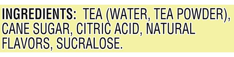 Ingredients: Tea (Water, Tea Powder), Cane Sugar, Citric Acid, Natural Flavors, Sucralose Contains 23mg of caffeine