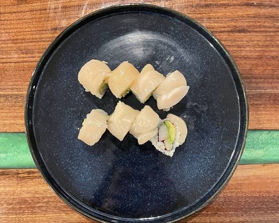 Crab stick and avocado inside topped with scallop scallion and masago chef's special sauce. Raw fish.