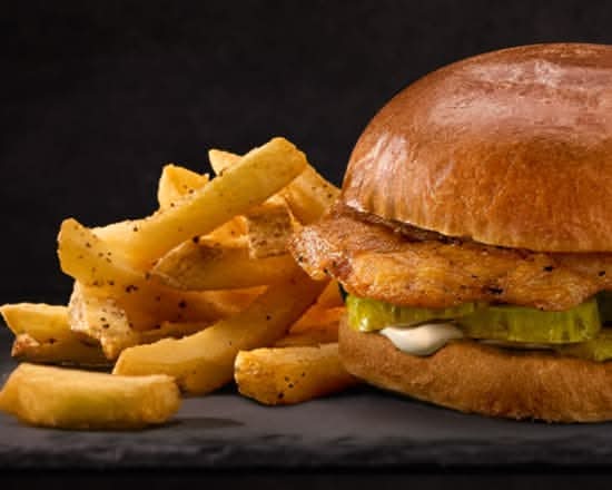 760 calories. Hand-breaded all white meat chicken, tomato, lettuce, pickles and mayonnaise spread on a toasted brioche bun.
