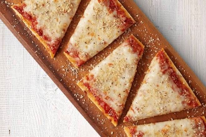 Deliciously crispy flatbread pizza topped with a four-cheese blend of provolone, parmesan, romano, and mozzarella.