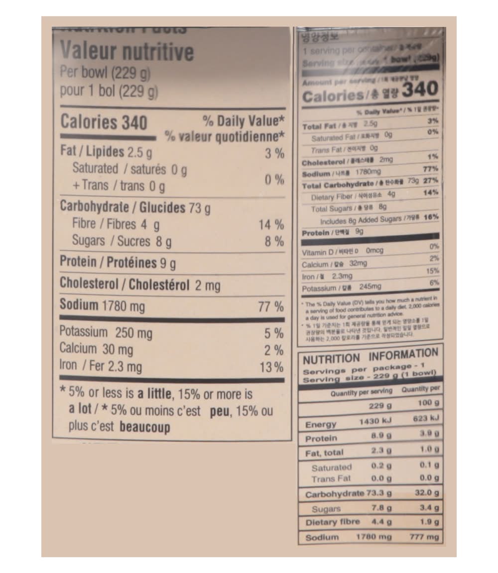 Ingredients: Noodle - Wheat Flour, Modified Tapioca Starch, Salt, Corn Oil, Acidity Regulator (Acetic Acid, Lactic Acid), Purified Water. Soup Base - Soy Sauce (Wheat, Soybean, Salt), Radish Juice Concentrate, Kelp Extract, Bonito Extract (Fish), Forest Mushroom (Shiitake) Concentrate, Yeast Extract (Barley), Dextrin, Glucose, Forest Mushroom (Shiitake) Powder, Anchovy Extract (Fish), Black Pepper Powder, Vinegar, Citric Acid, Potassium Carbonate, Purified Water, Sugar, Salt. Dried Flake - Fried Starch, Green Onion, Dehydrated Fish Cake, Red Pepper, Laver, Sesame Seed. Sesame Oil - Sesame Seed Contains: 'Contains Wheat', 'Contains Soybeans', 'Contains Fish', 'Contains Sesame', 'May Contain Eggs', 'May Contain Milk', 'May Contain Tree Nuts', 'May Contain Crustacean Shellfish'
